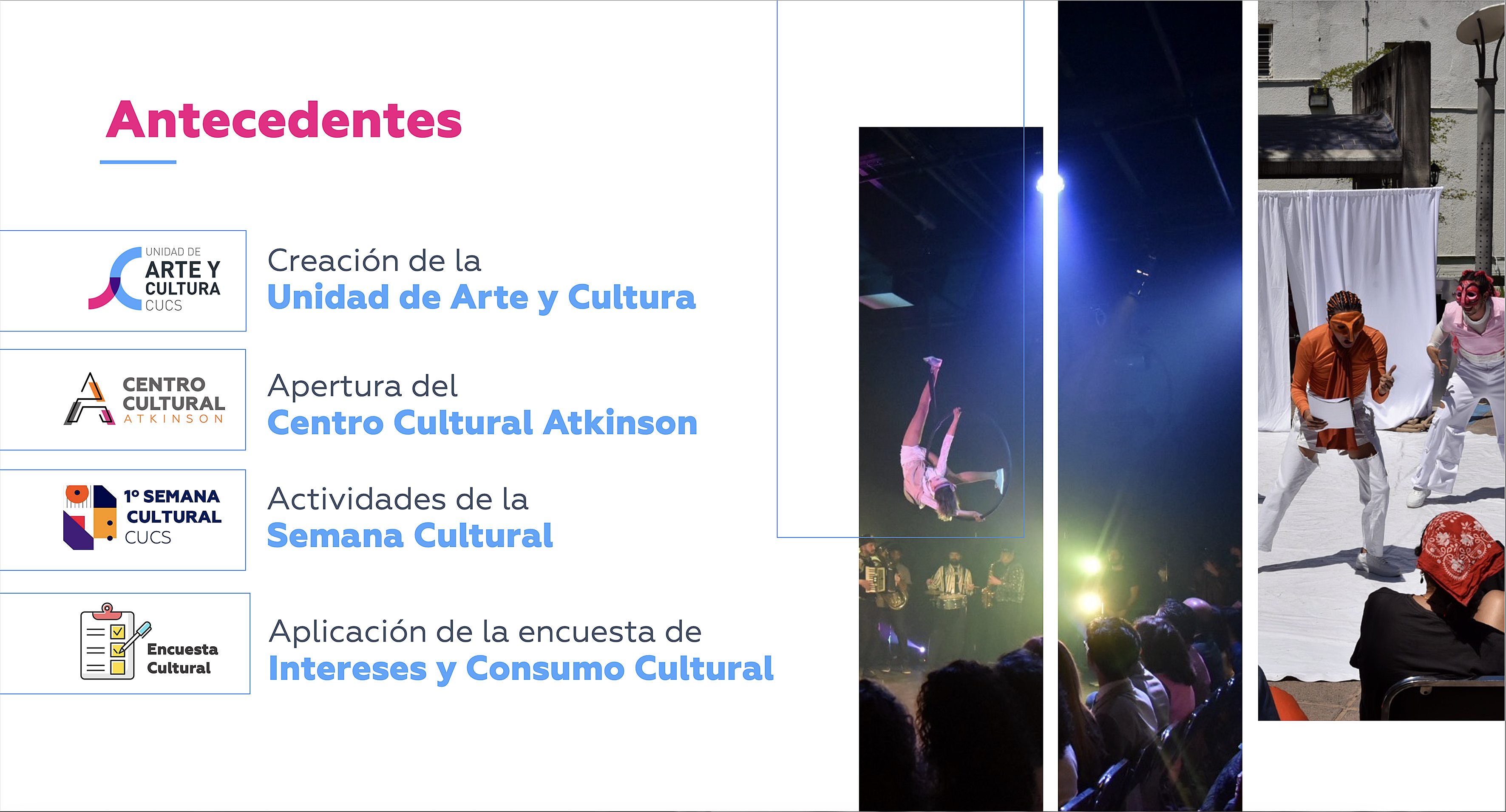 “Por un lado, nuestro proyecto cultural se encuentra en un momento en el que el CUCS necesita artistas para impulsar su programa cultural; es decir, el proyecto cultural necesita tener expertos en las artes que puedan dar talleres u ofrecer una oferta cultural”, resaltó.