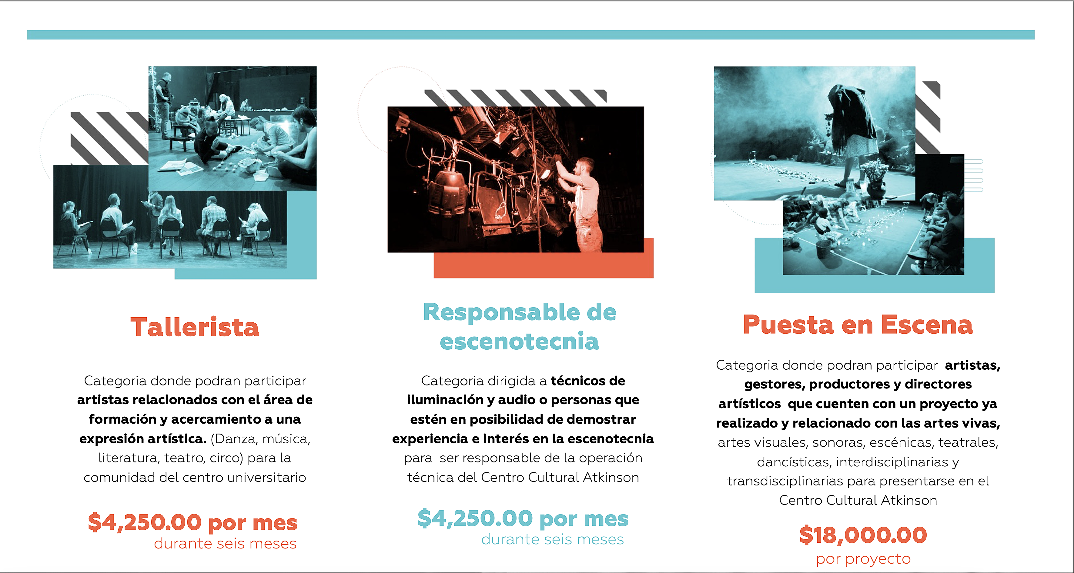 A través de la segunda categoría se busca a dos personas responsables de la escenotecnia del Centro Cultural Atkinson, quienes recibirán mensualmente un apoyo económico de 4 mil 250 pesos durante seis meses.