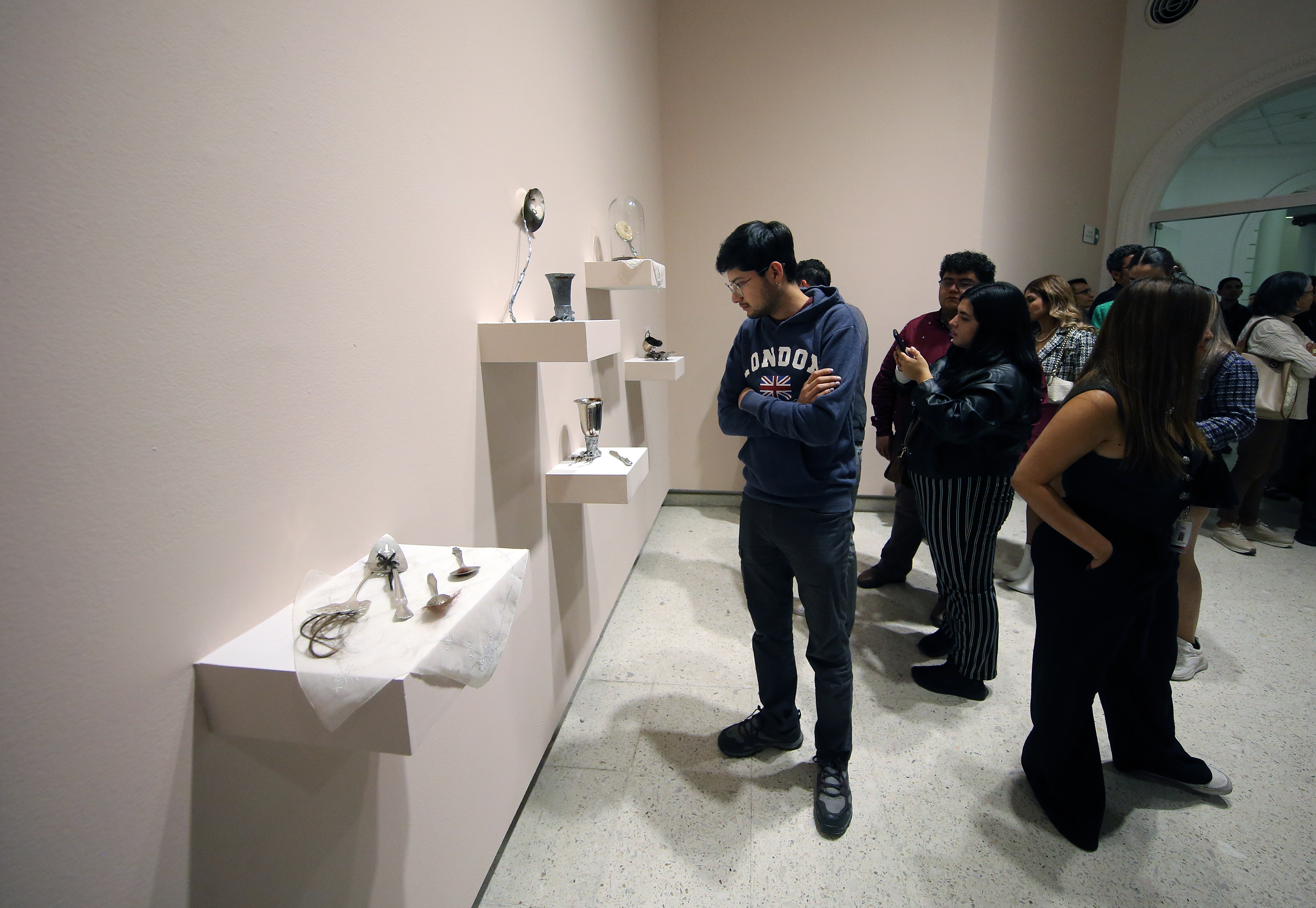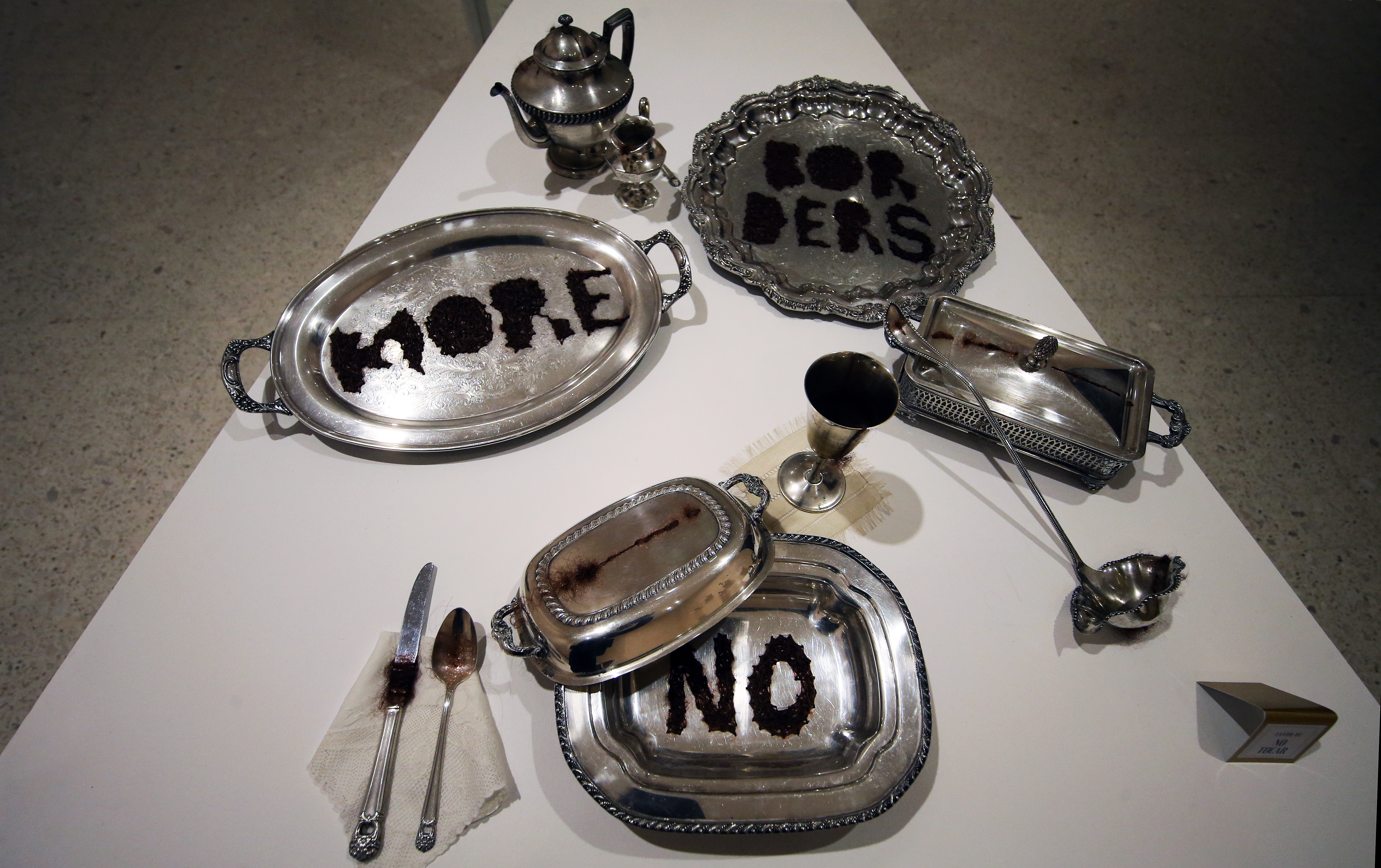 La primera sala está ocupada con una mesa atravesada con utensilios de plata y cobre intervenidos con cabello de la artista y de otras mujeres, arte-objeto que representa la desigualdad vista en un espejo que surca la mesa.