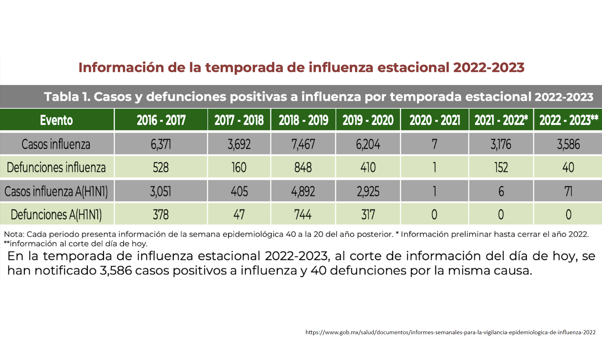 Los datos disponibles en la semana 47 son: 3 mil 586 casos y 40 defunciones, sin contar las últimas semanas que aumentaron y seguirá aumentando; por lo cual, recomendó fomentar la vacunación para la influenza estacional.