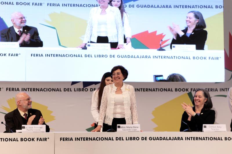 La maestra María Elena Saucedo Lugo recibió el Homenaje al Bibliotecario de manos del Presidente de la Feria Internacional del Libro de Guadalajara (FIL), maestro José Trinidad Padilla López, y que le fue otorgado por su labor de fomento a la lectura y la preservación de los libros.