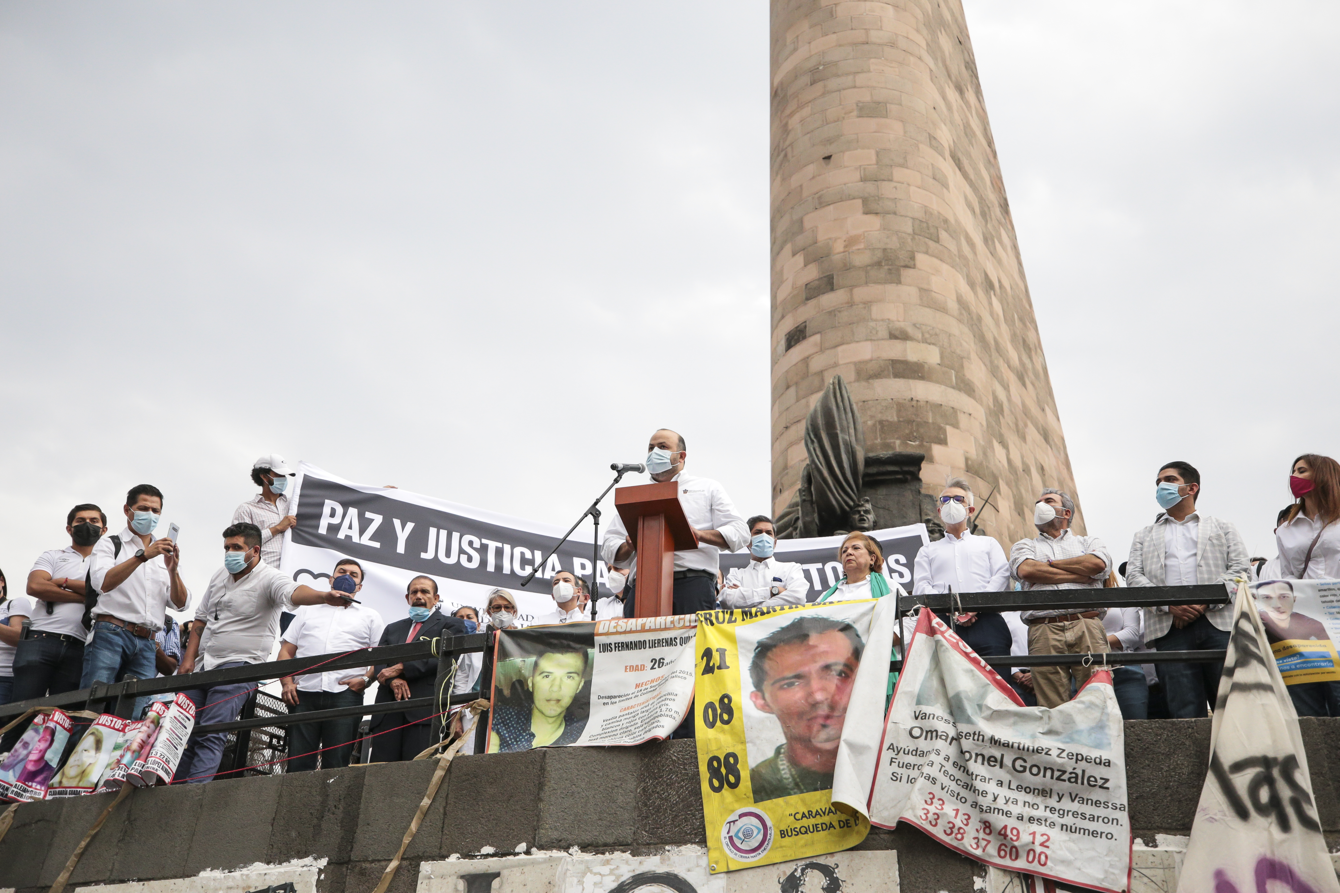 “En esta Glorieta de las y los Desaparecidos ya no queda ni un hueco, no cabe ni un nombre más. Jalisco vive su peor historia de horror. Hace cinco años cuando tres estudiantes de cine fueron privados de su libertad y nunca volvieron a su casa y nos dijeron que fueron disueltos en ácido, creíamos que era el límite. El año pasado, nuestro compañero José Francisco fue el primer estudiante cuyos restos son encontrados en una fosa y lo pudimos identificar por el tatuaje de una manzana y, hace un año pedimos justicia por él aquí. Nos hicieron sentir que la calle era insegura, pensábamos que en nuestra casa era el lugar donde podíamos vivir en paz. Pero lo que pasó el año pasado nos demuestra que ni siquiera en nuestra casa podemos vivir seguros y seguras”.
