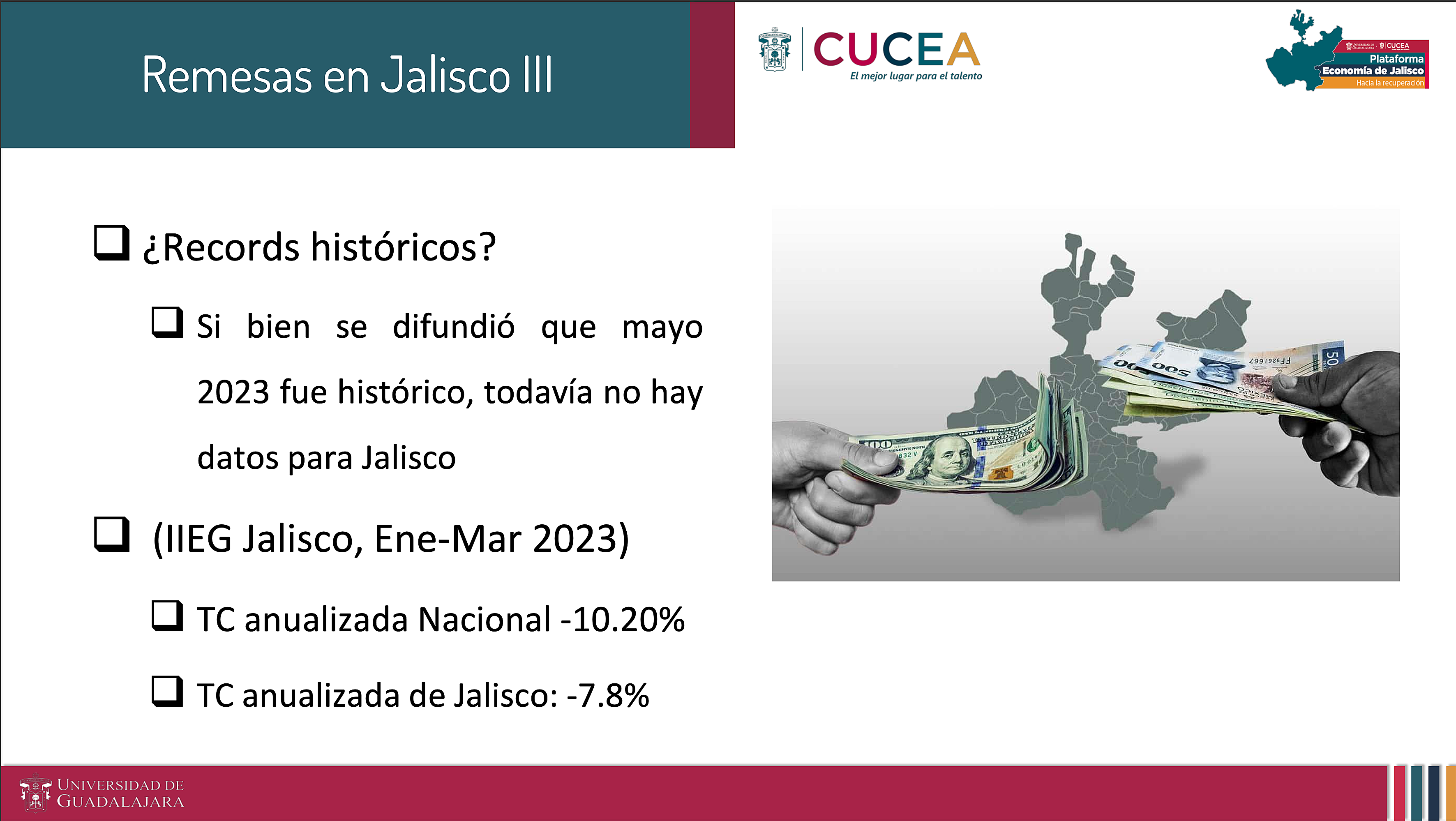 A pesar de que Jalisco es la entidad que recibe más remesas procedentes de Estados Unidos, la disminución en el precio del dólar y la inflación que se vive en México han provocado que se reduzca el poder adquisitivo de quienes reciben estos ingresos en el país, así lo dijeron en rueda de prensa especialistas del Centro Universitario de Ciencias Económico Administrativas (CUCEA) de la UdeG.