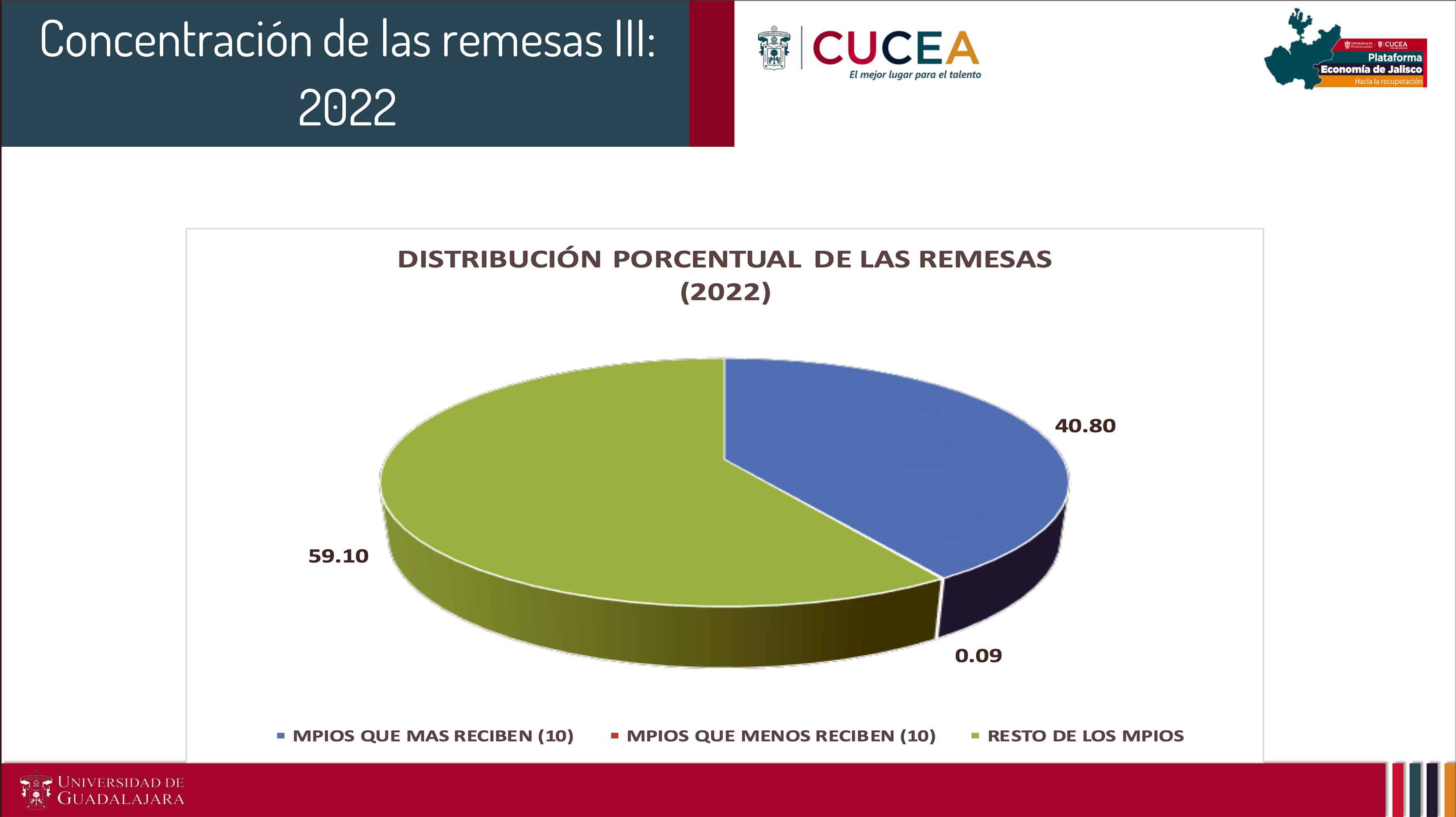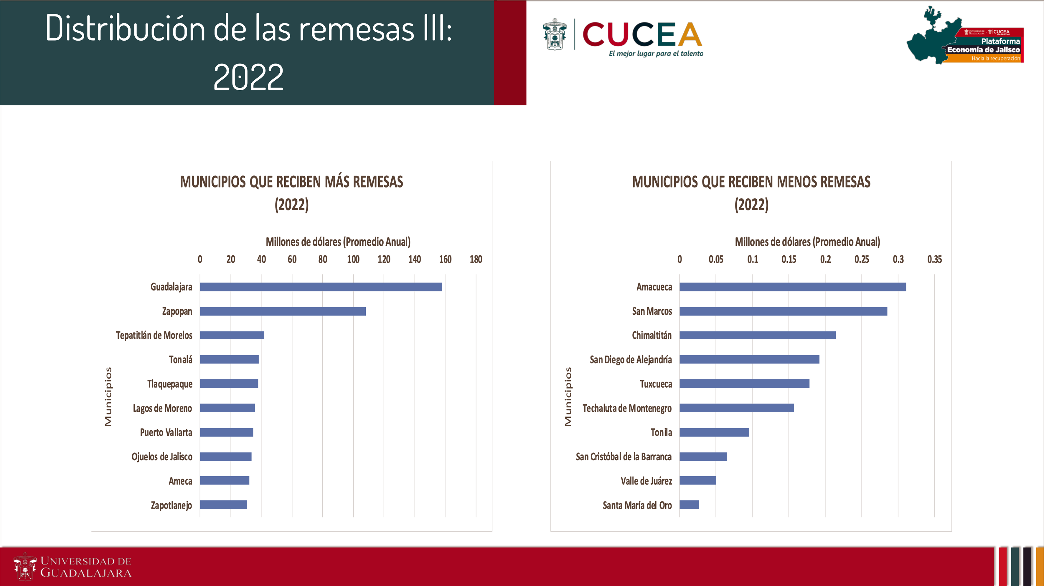 Ruiz Porras explicó que en el caso de Jalisco son diez los municipios que reciben más de 40 por ciento del total de las remesas, por lo que Ruiz Porras consideró que existe una desigualdad en la distribución de estos ingresos.