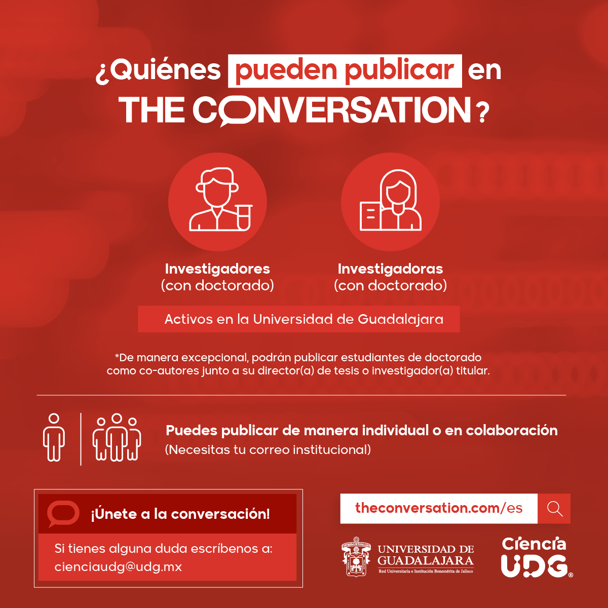 La participación en The Conversation ES está disponible para investigadoras e investigadores activos en la UdeG con grado de doctorado, así como para estudiantes de doctorado en colaboración con alguna o algún investigador de la Red Universitaria.