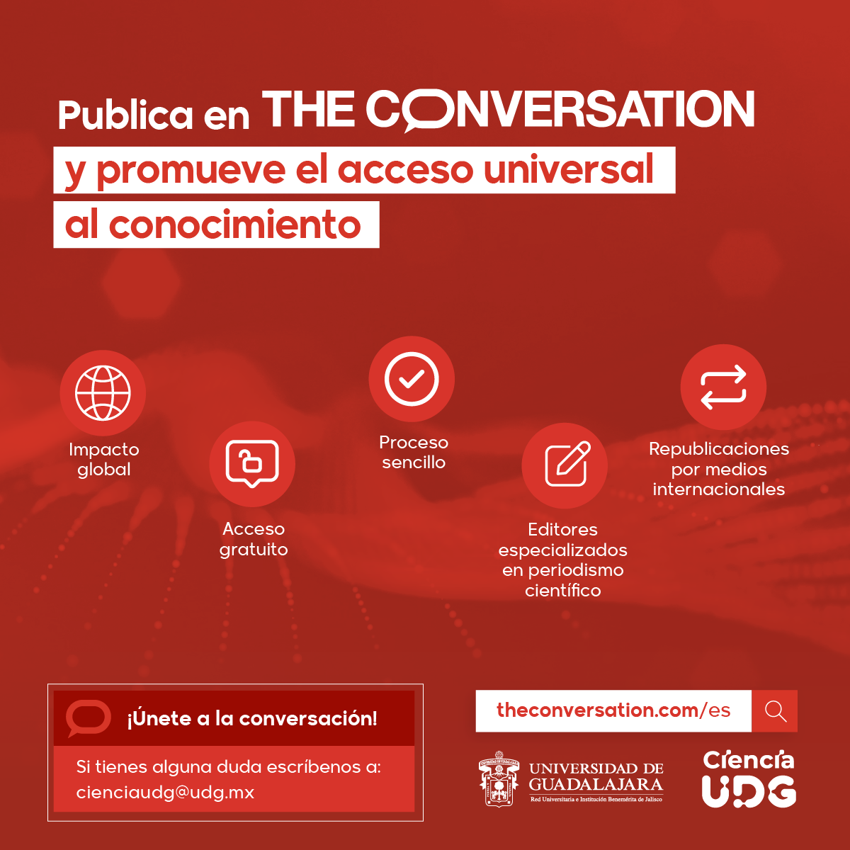 Desde 2023 la Universidad de Guadalajara (UdeG) participa activamente en la plataforma The Conversation ES con artículos de divulgación científica escritos por sus investigadores, con el objetivo de comunicar el conocimiento científico generado por su comunidad.
