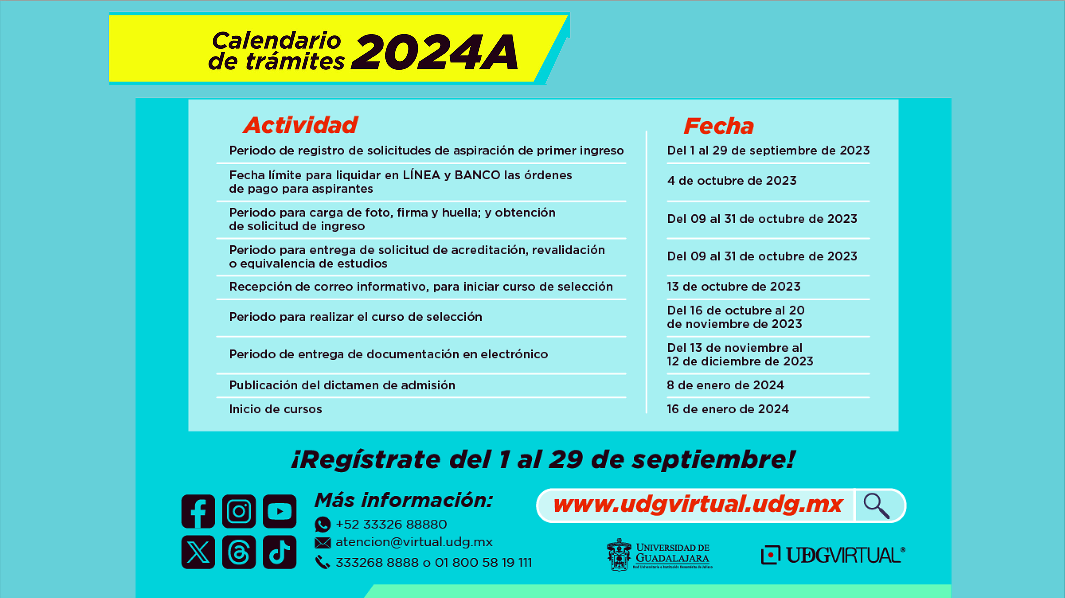 Las personas interesadas pueden consultar el calendario de registro en el sitio web www.udgvirtual.udg.mx, donde también se encuentra la lista completa de carreras disponibles, como Administración de las organizaciones, Desarrollo de sistemas web, Gestión de la cultura, Periodismo digital, Seguridad ciudadana, entre otras más.