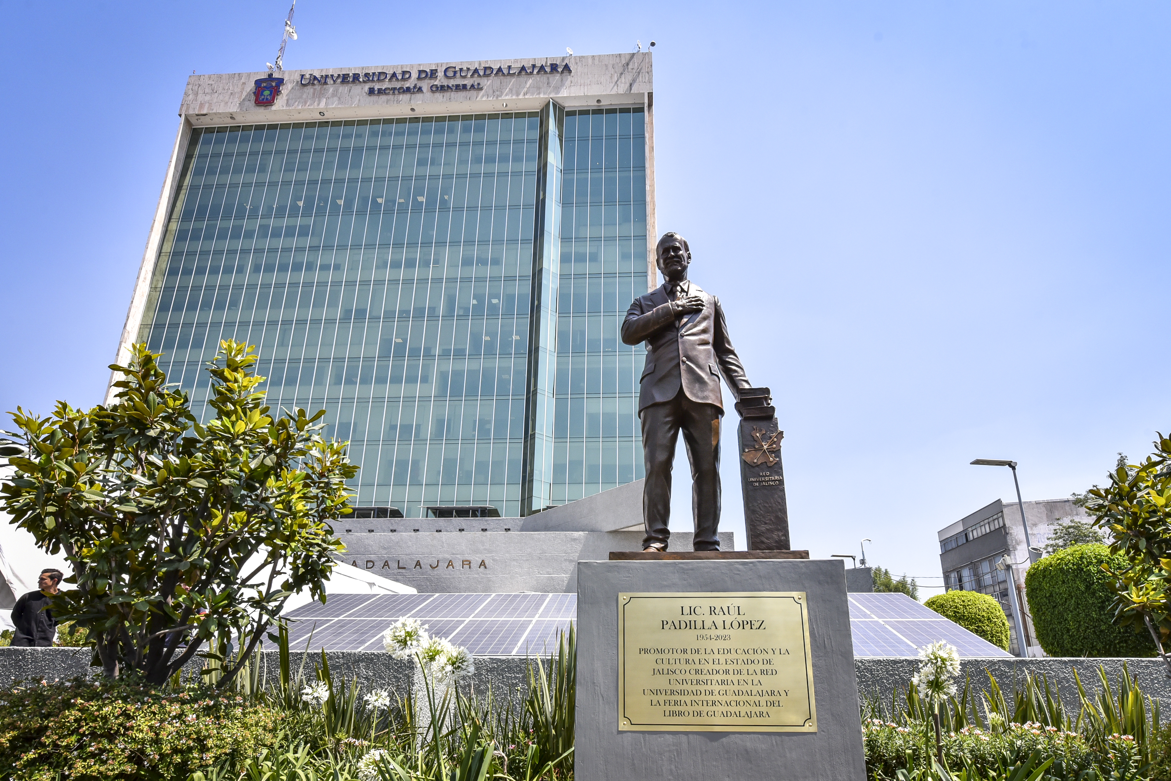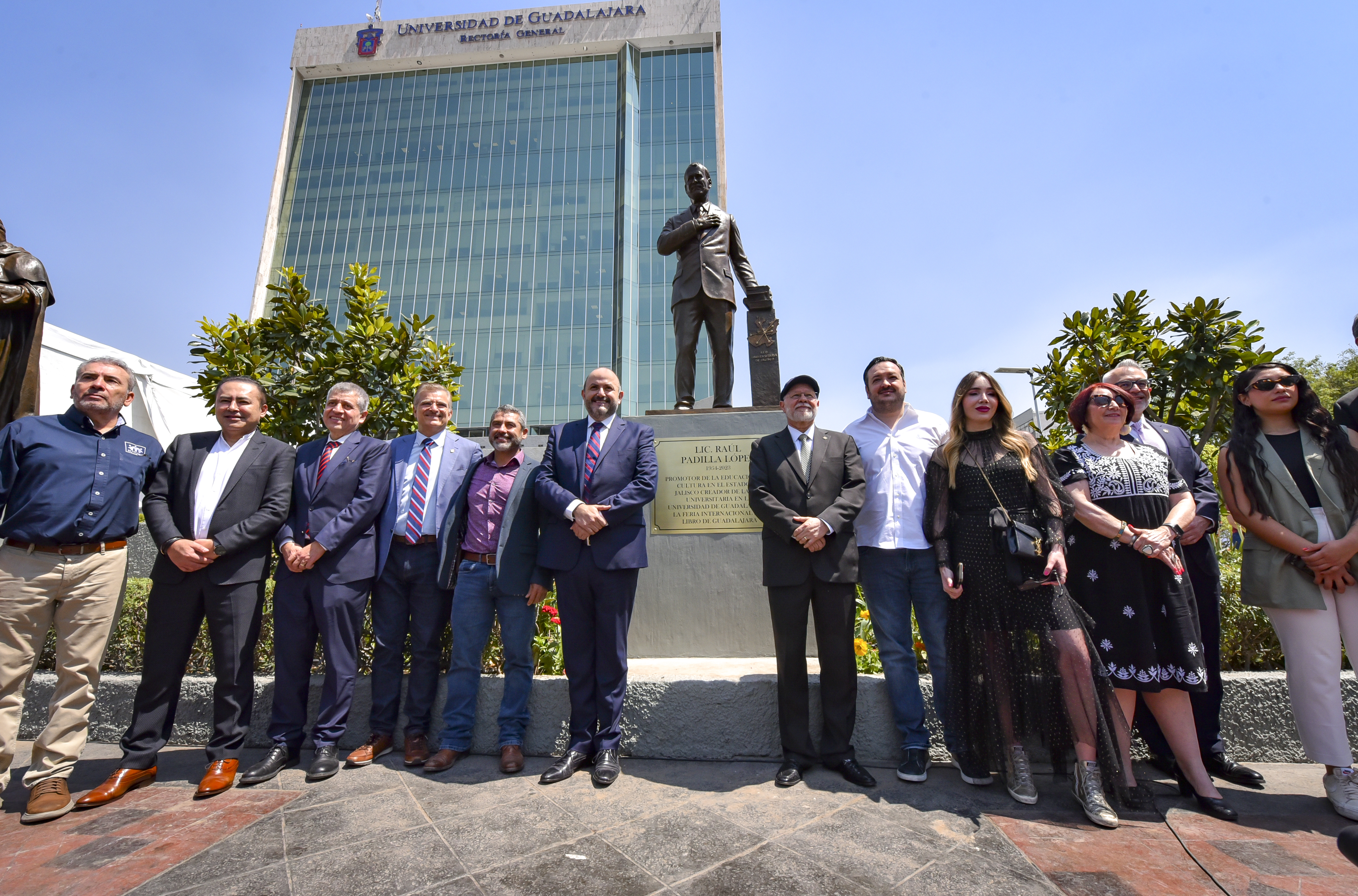 Este viernes 3 de mayo por la mañana, en el día en que cumpliría 70 años, fue develada la estatua en memoria de Raúl Padilla López en la explanada del edificio de Rectoría General de la Universidad de Guadalajara (UdeG), que se sumó al paisaje urbano tapatío para honrar su legado como uno de los promotores culturales de Jalisco.
