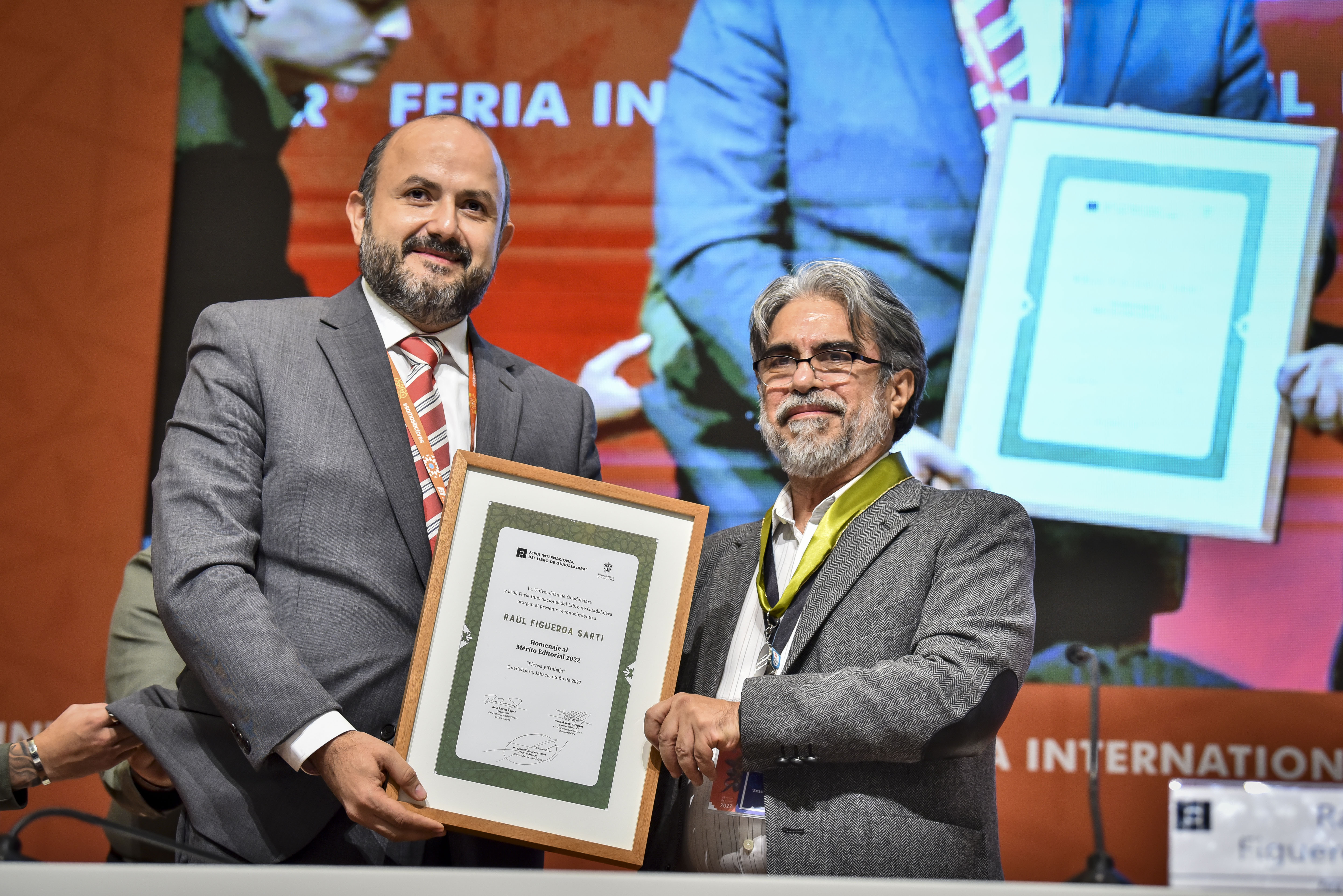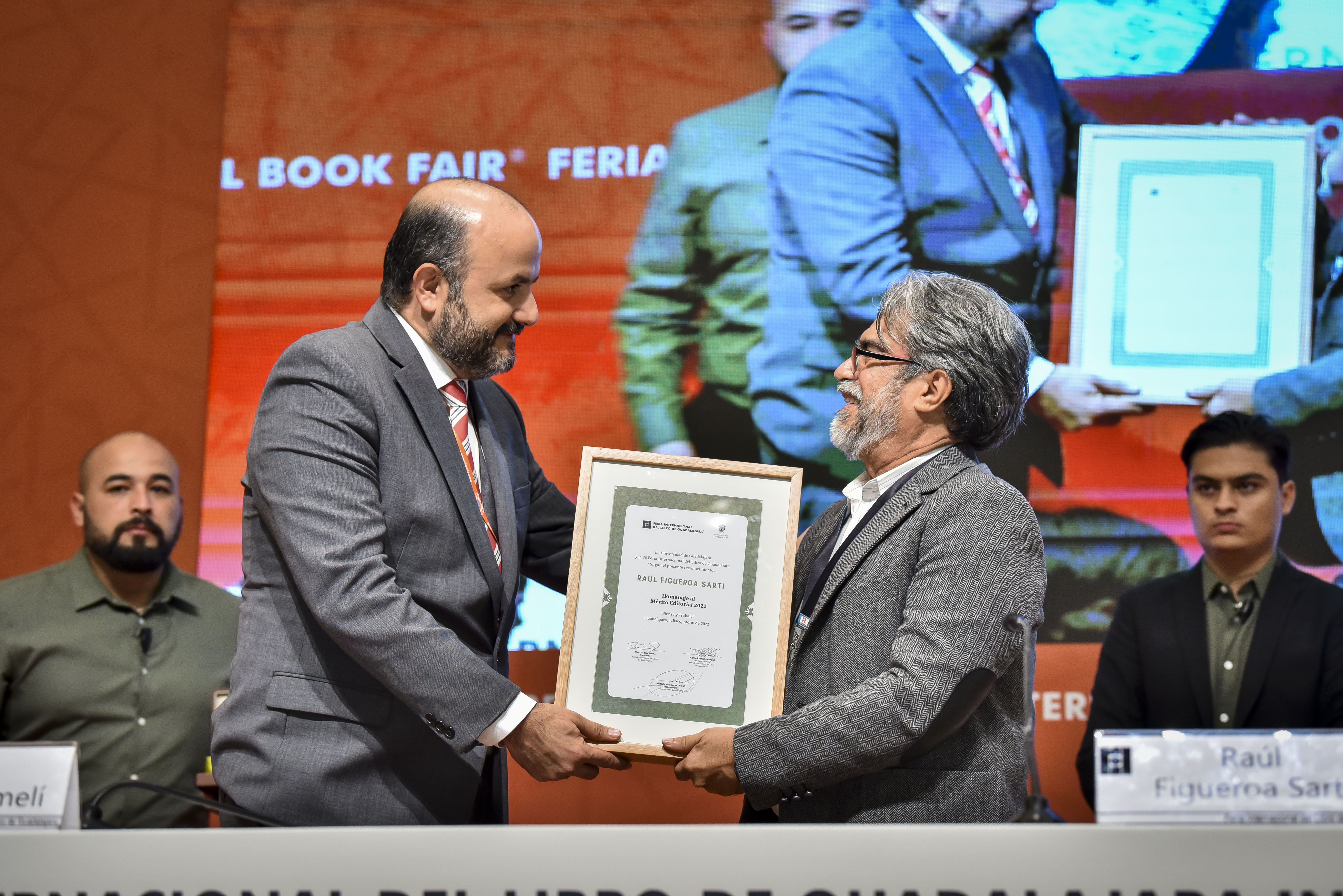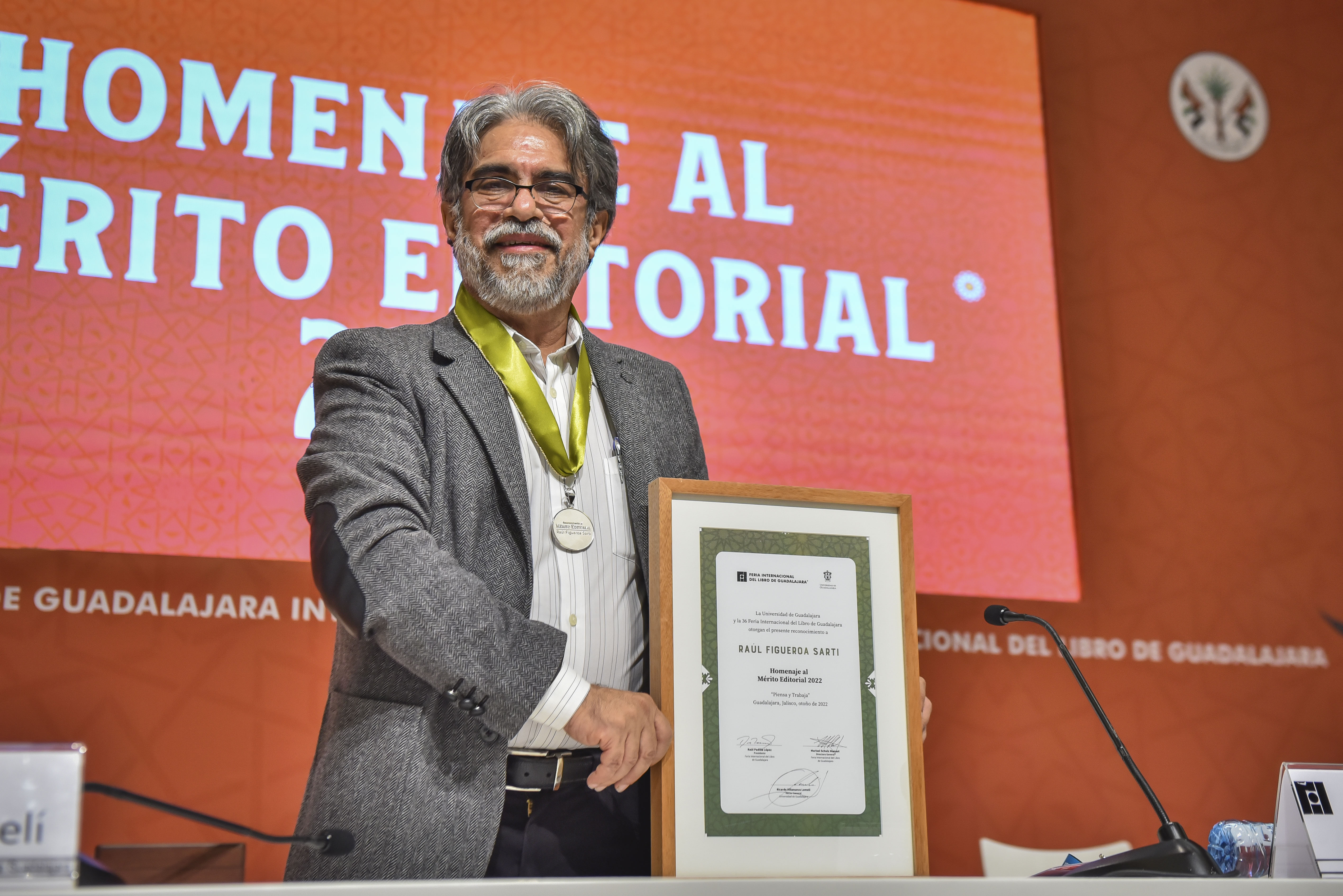 El editor y fundador de la editorial independiente F&G Editores, Raúl Figueroa Sarti, originario de Guatemala, recibió de manos del Rector General de la Universidad de Guadalajara (UdeG), doctor Ricardo Villanueva Lomelí, el Homenaje al Mérito Editorial en la Feria Internacional del Libro de Guadalajara (FIL 2022).