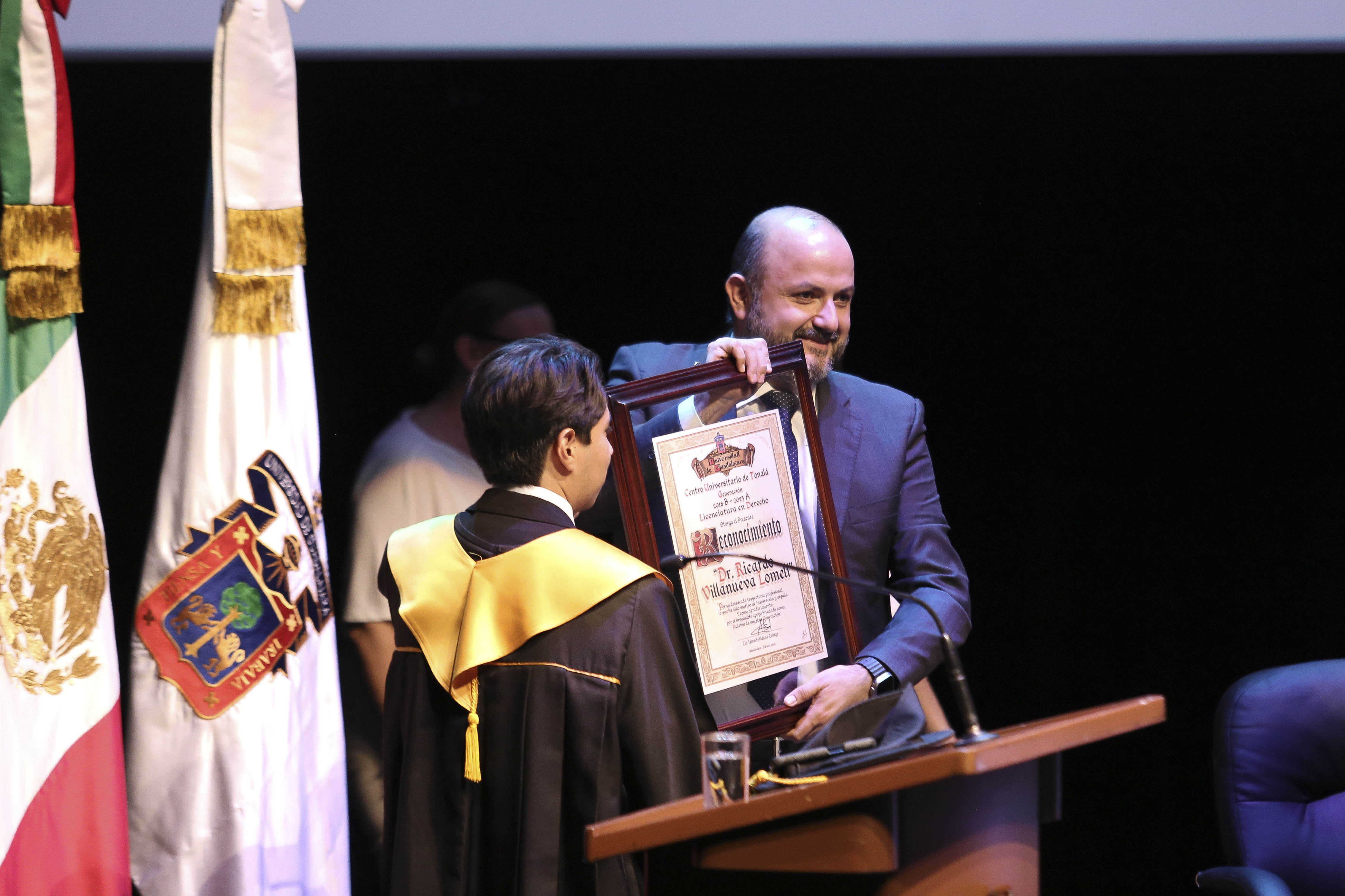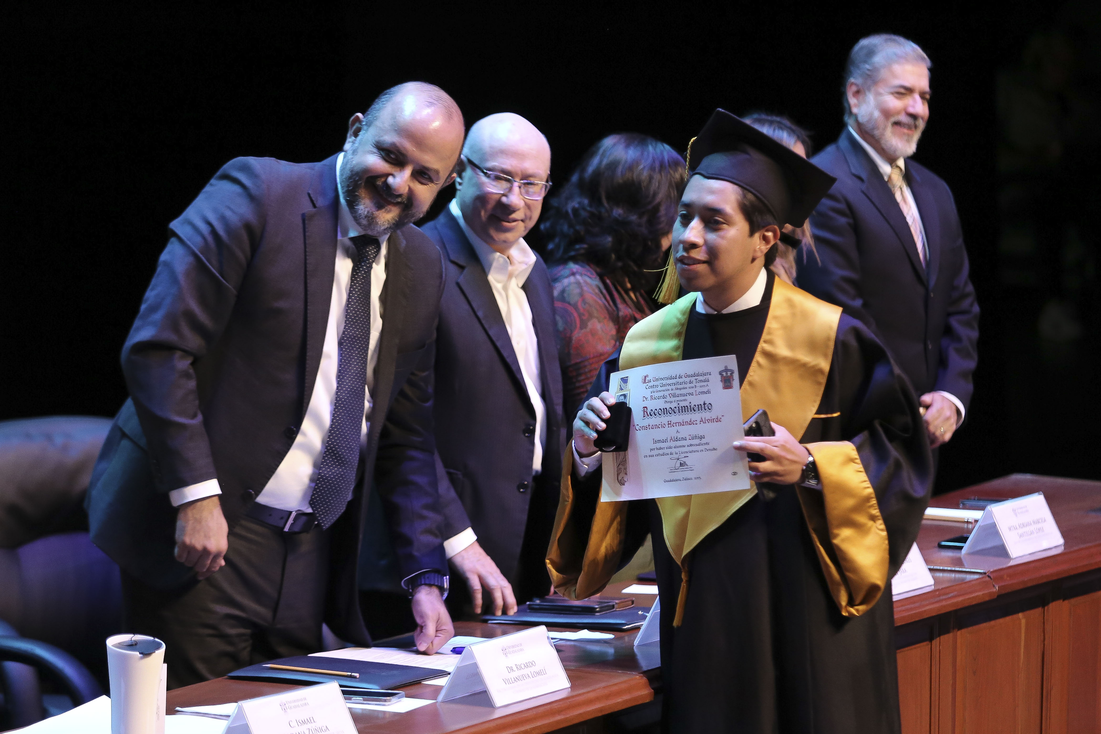 El representante de la generación, Ismael Aldana Zúñiga, quien también obtuvo el mejor promedio con 98.71, externó que están agradecidos con el CUTonalá y que el Rector General haya aceptado la invitación a ser su padrino, a quien además le entregó un reconocimiento.