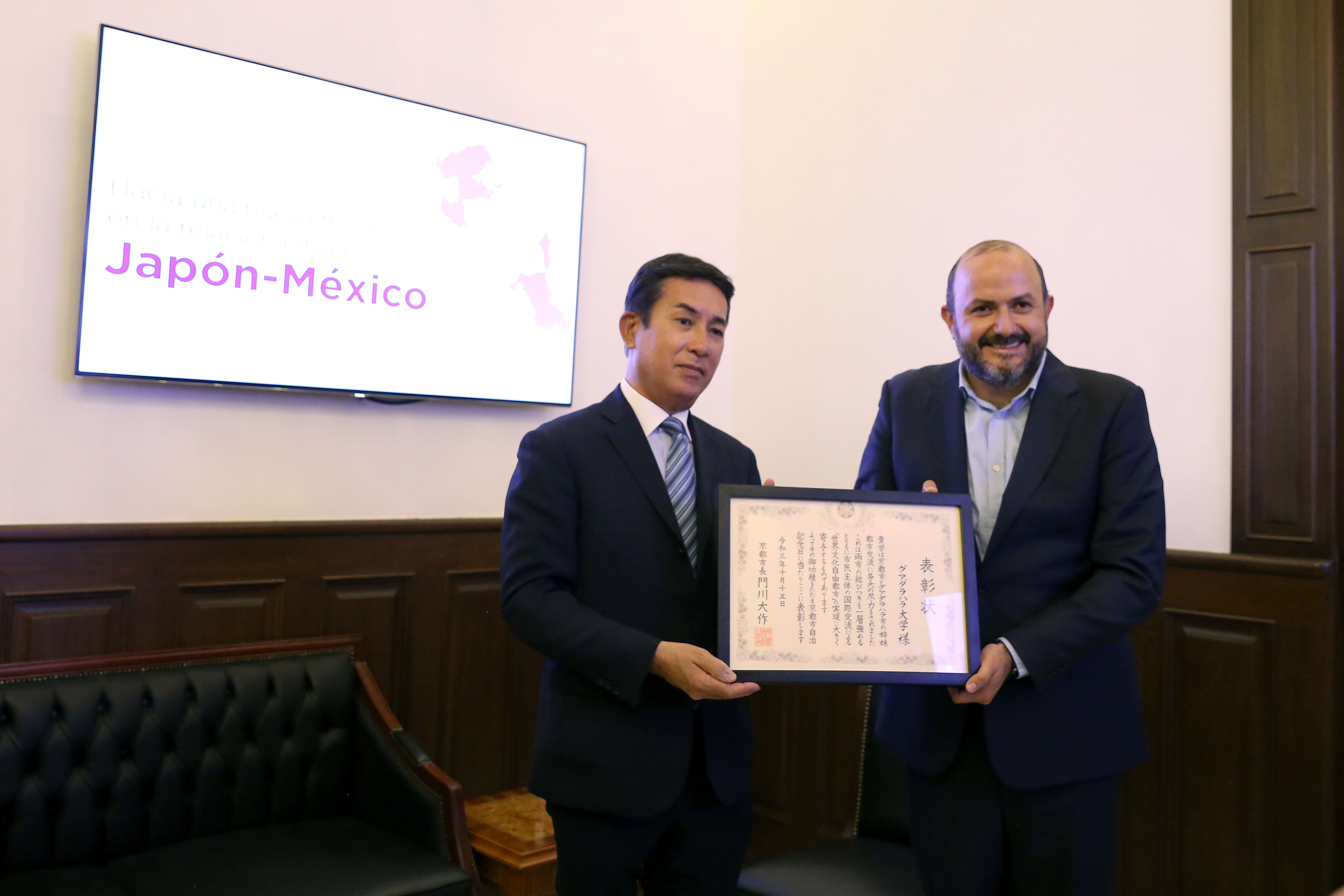 Durante esta charla, que forma parte del “Encuentro México-Japón, presencia japonesa en Jalisco. Conmemoración por el 125 aniversario de la migración japonesa a México”, la UdeG también recibió un reconocimiento por la hermandad que existe entre la ciudad de Kioto y Guadalajara.