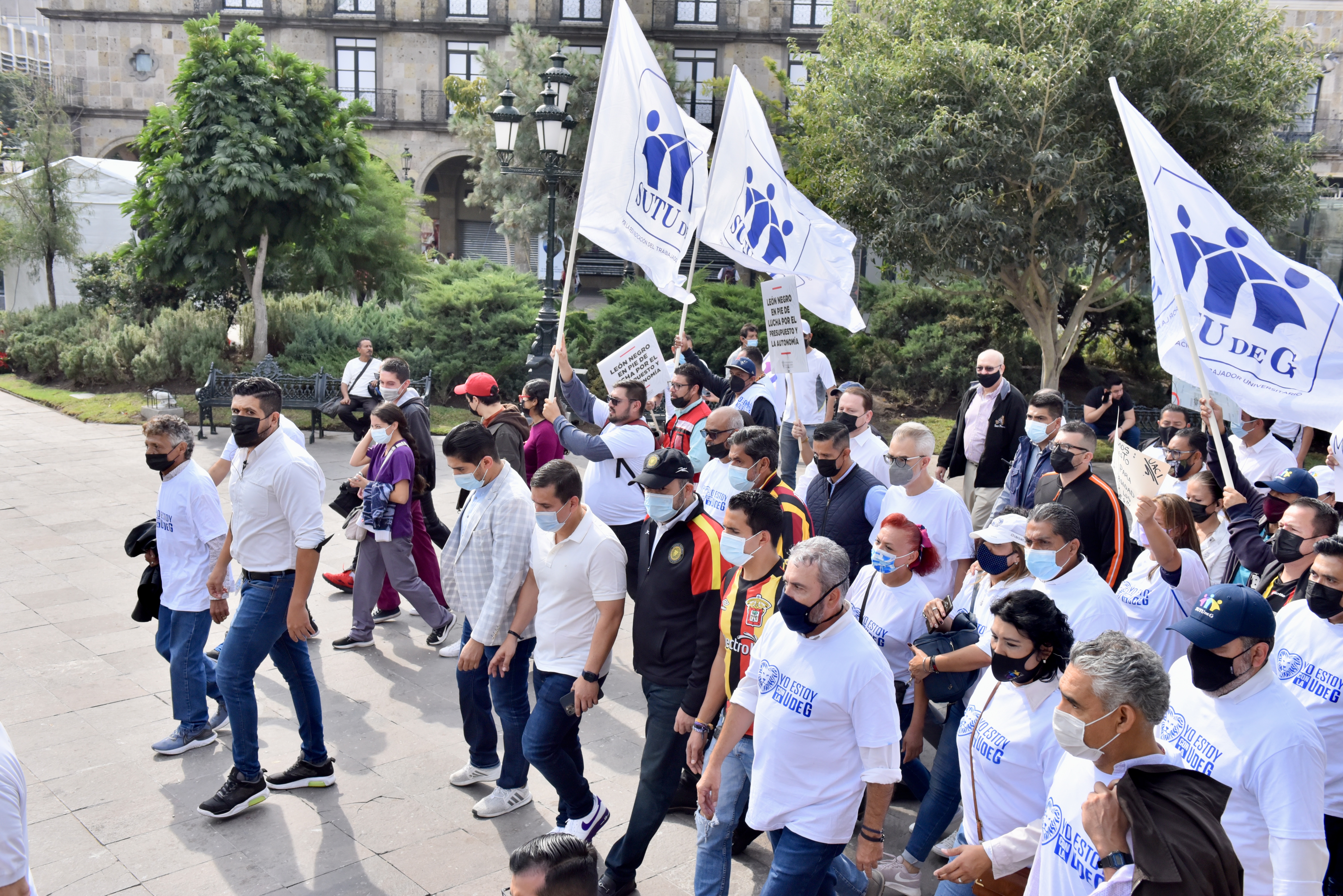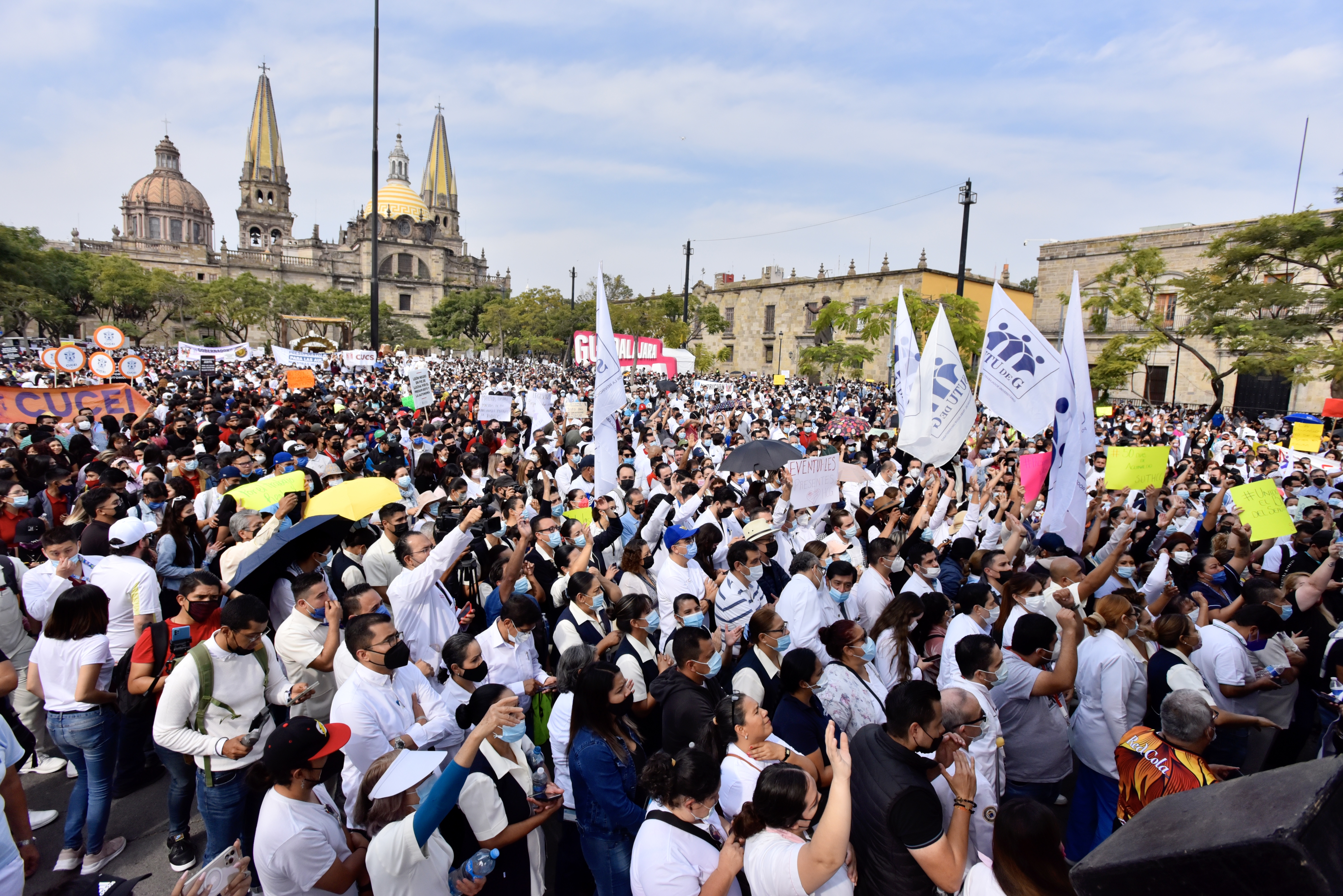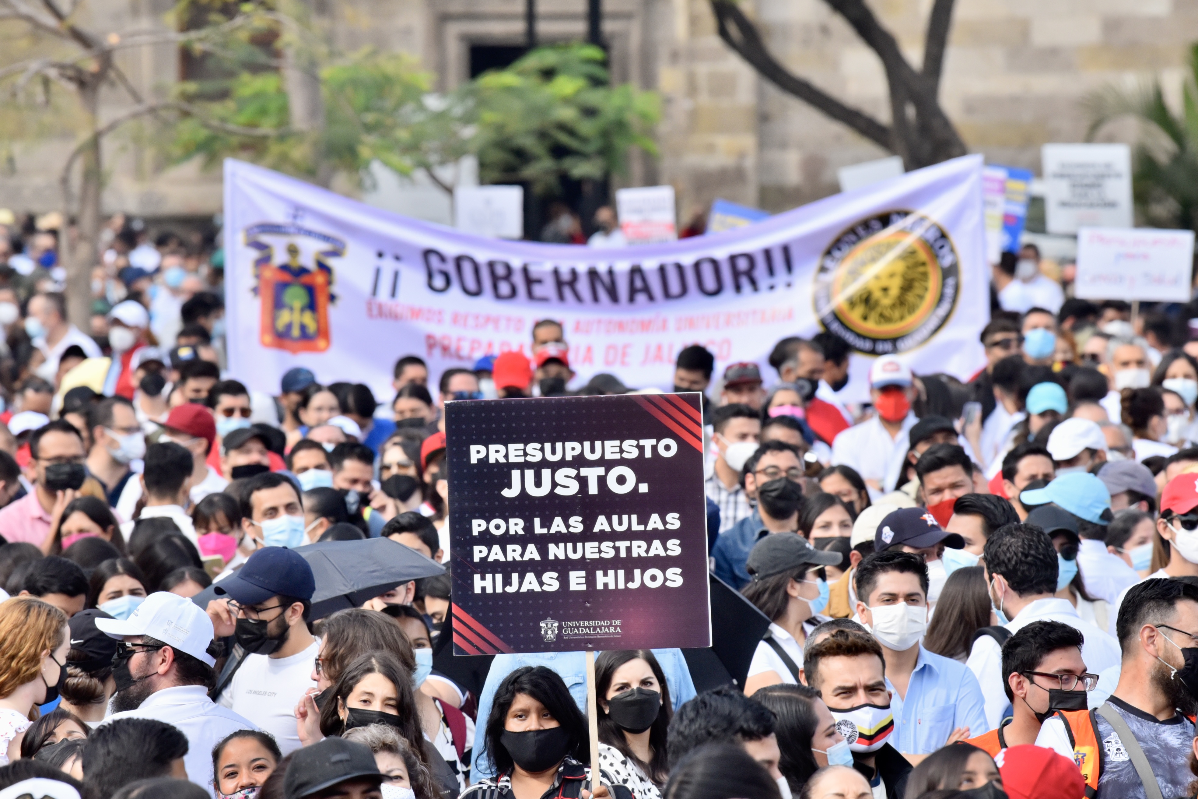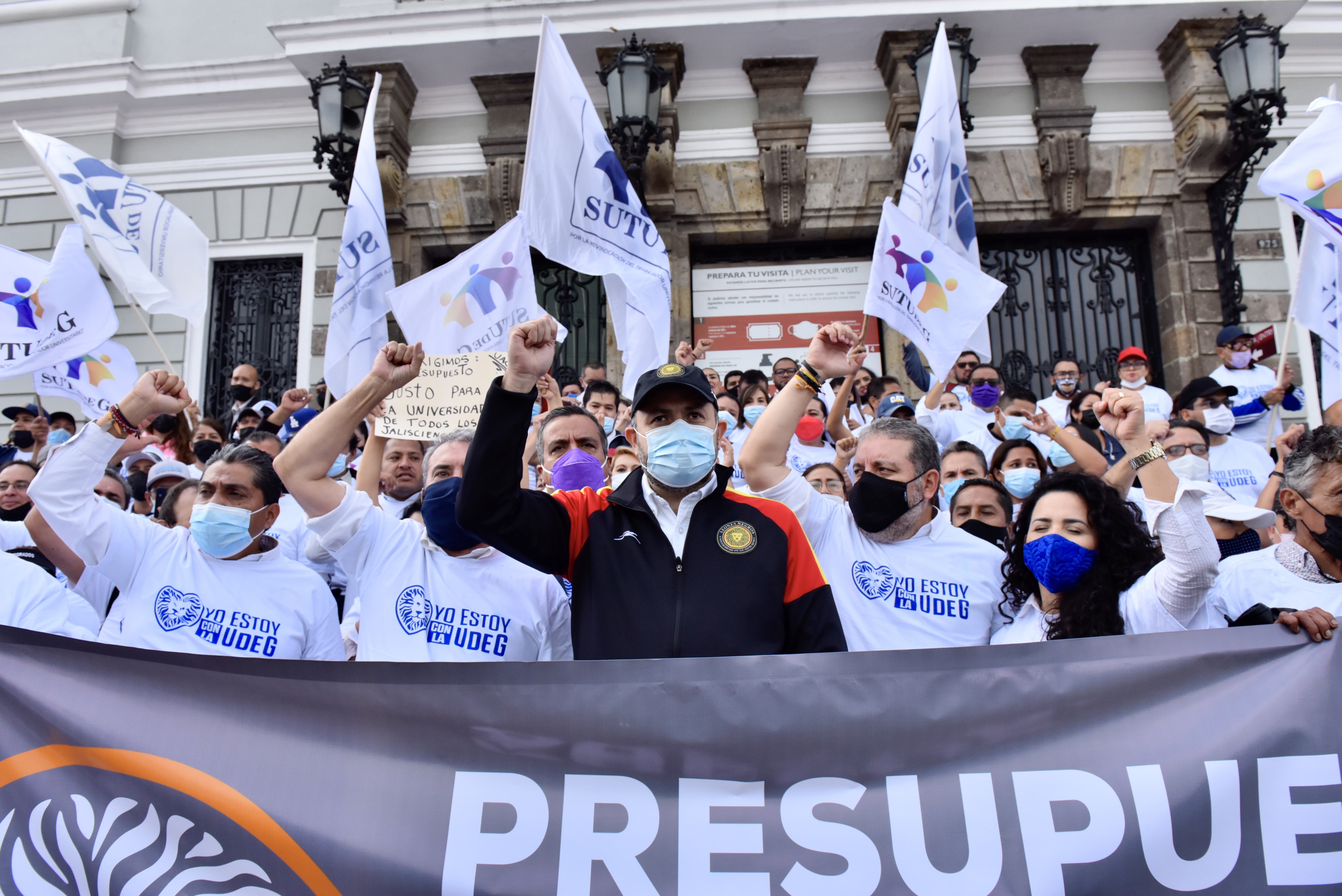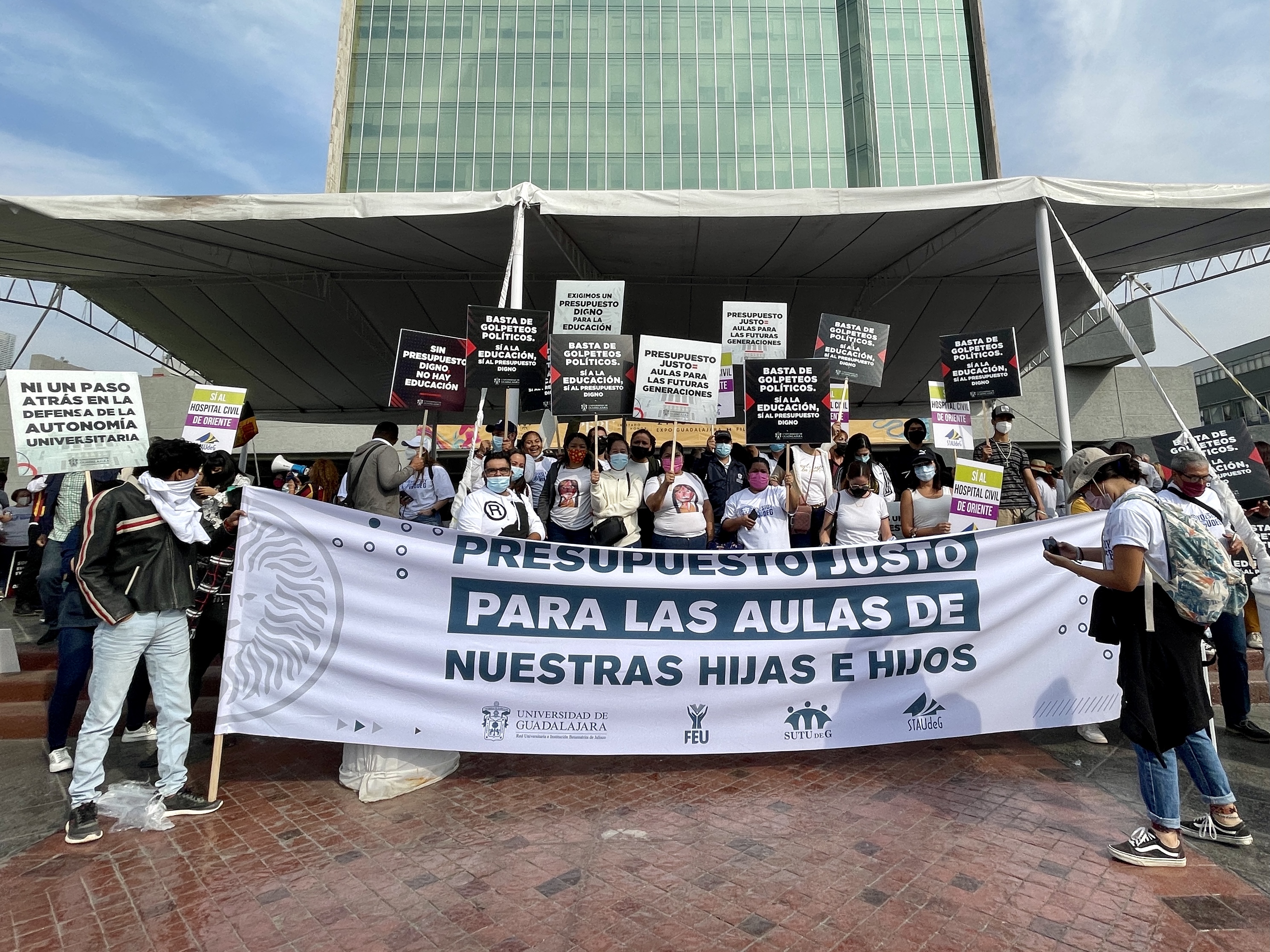 Frente al Congreso del Estado, universitarias y universitarios provenientes de todos los centros universitarios, preparatorias, hospitales civiles, sindicatos y dependencias adscritas de todas las regiones de Jalisco, protestaron por el albazo que diputadas y diputados pretenden realizar para aprobar el presupuesto de la UdeG para 2022.