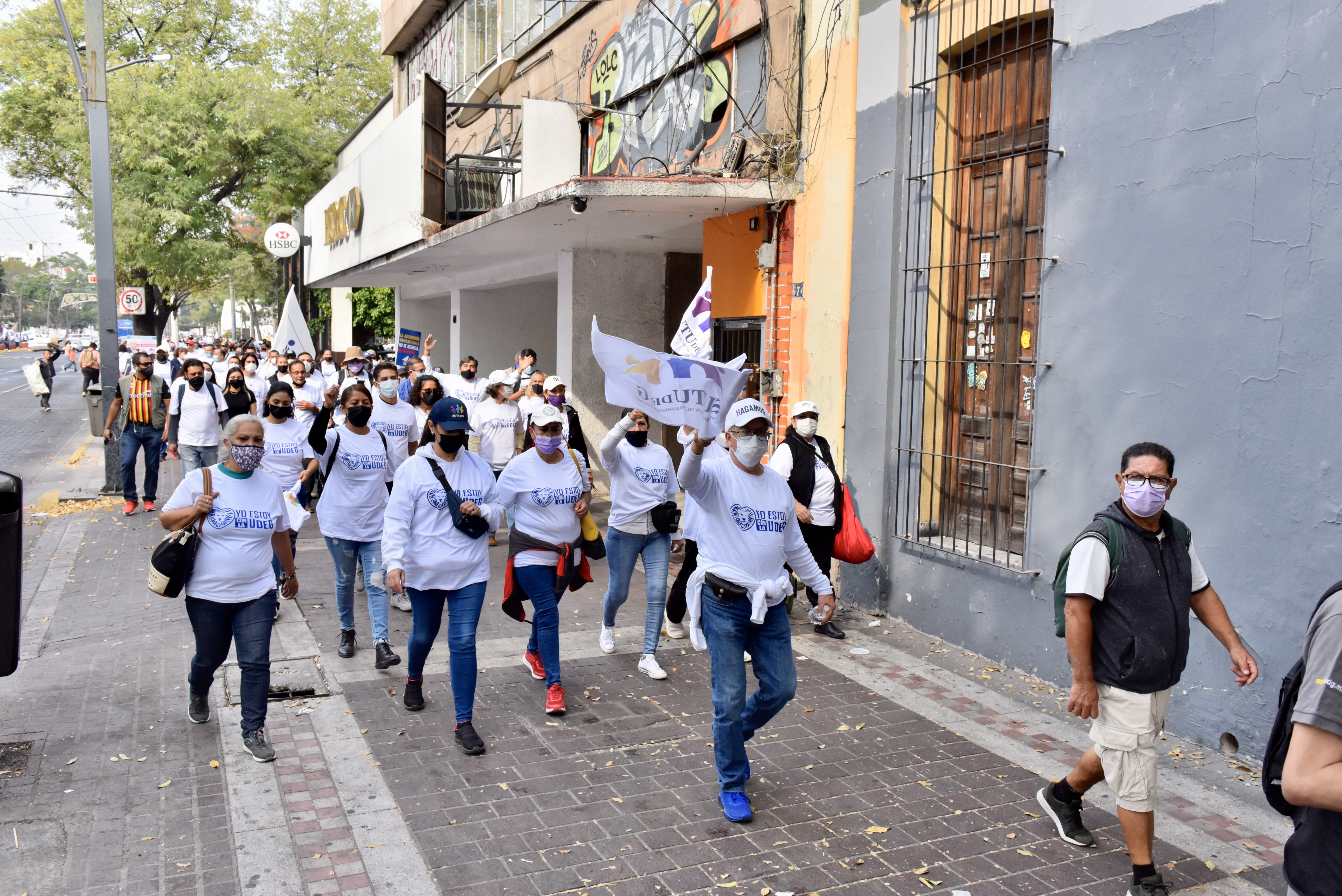 “¡Universidad!”. “¡No estás solo!”. “¡Vamos por los dos!”. “¡UdeG, UdeG!”, fueron algunas consignas que se escucharon por las calles del Centro de la ciudad hasta la Plaza de la Liberación. Las y los universitarios caminaron por las banquetas con el fin de no obstruir las circulaciones viales.