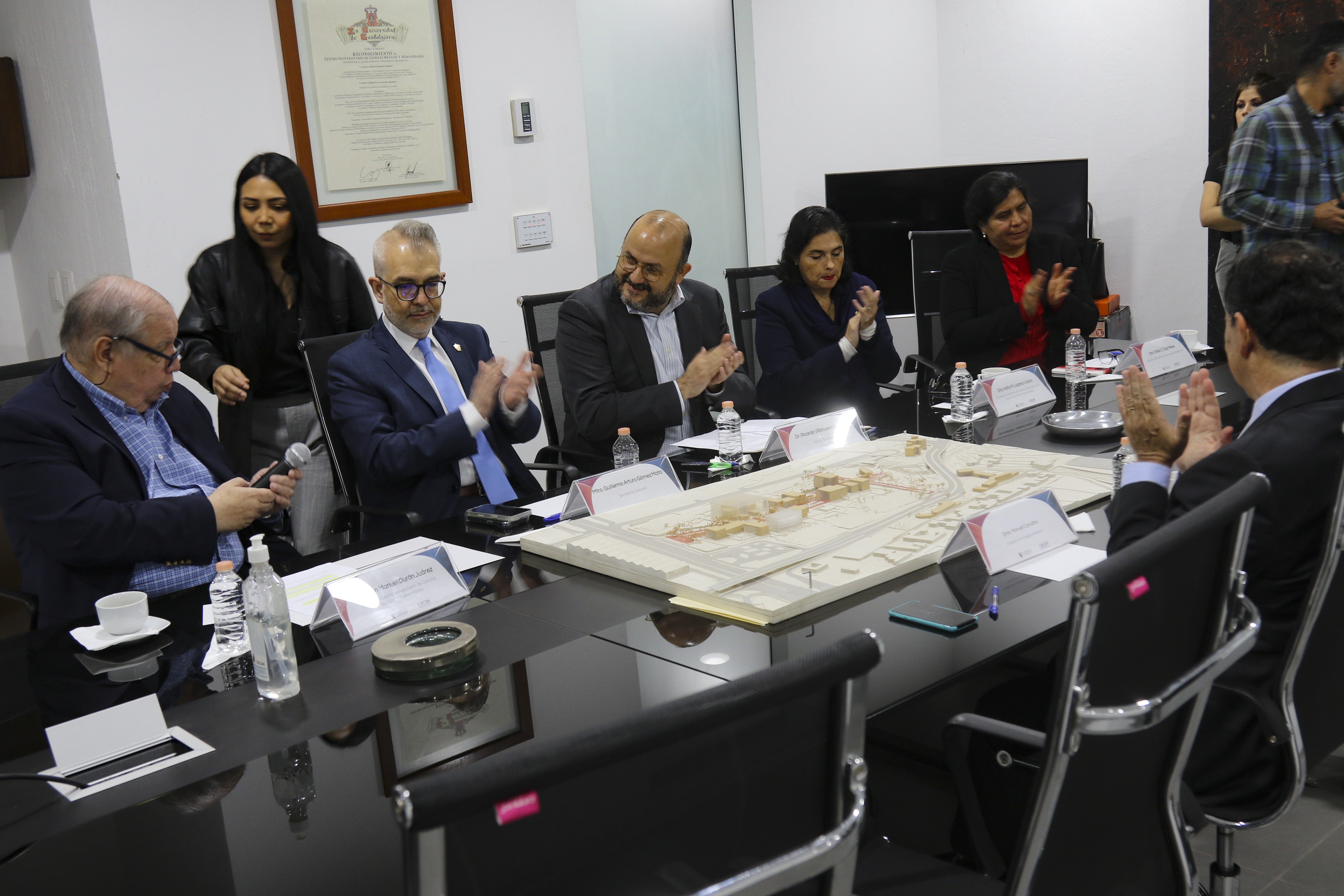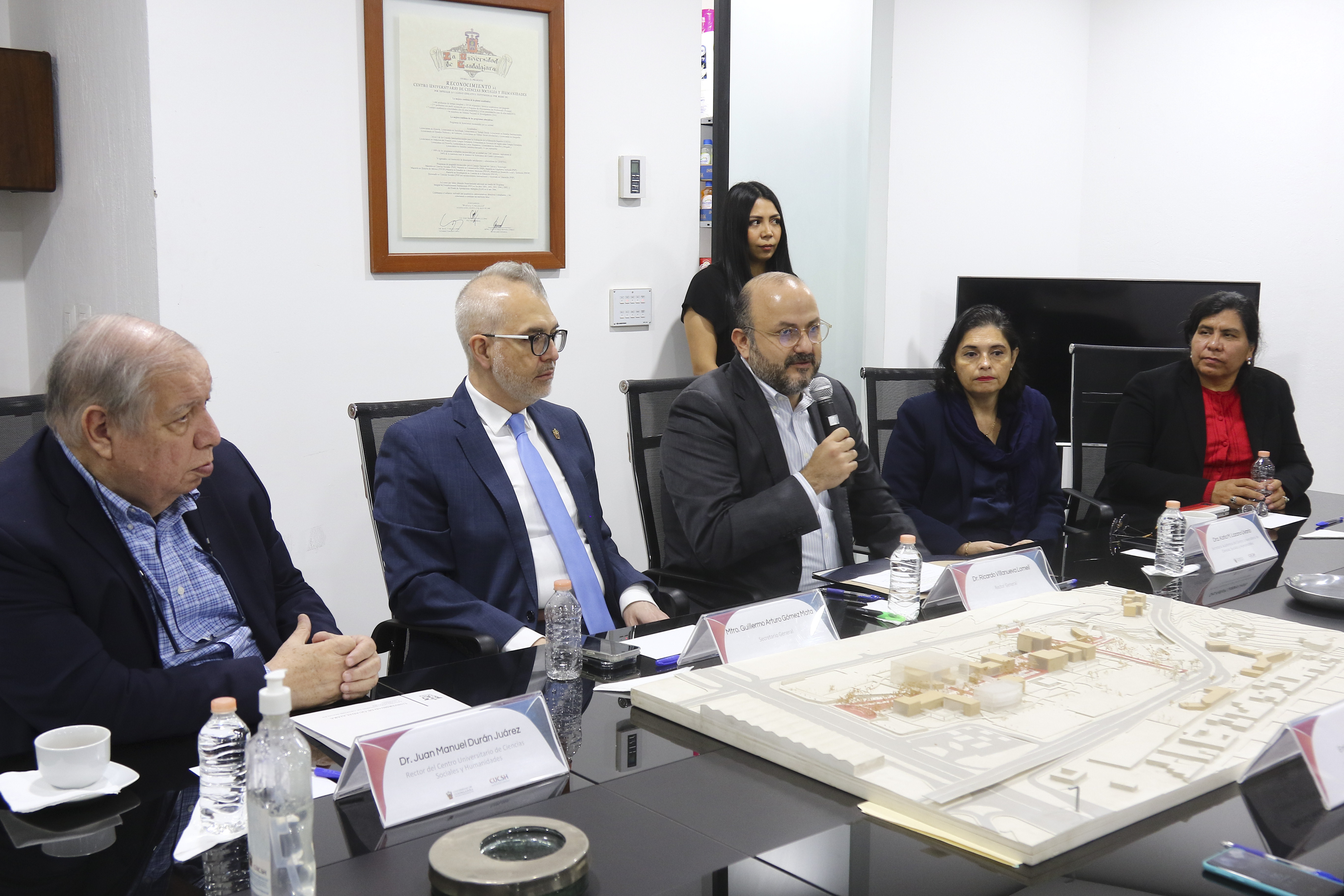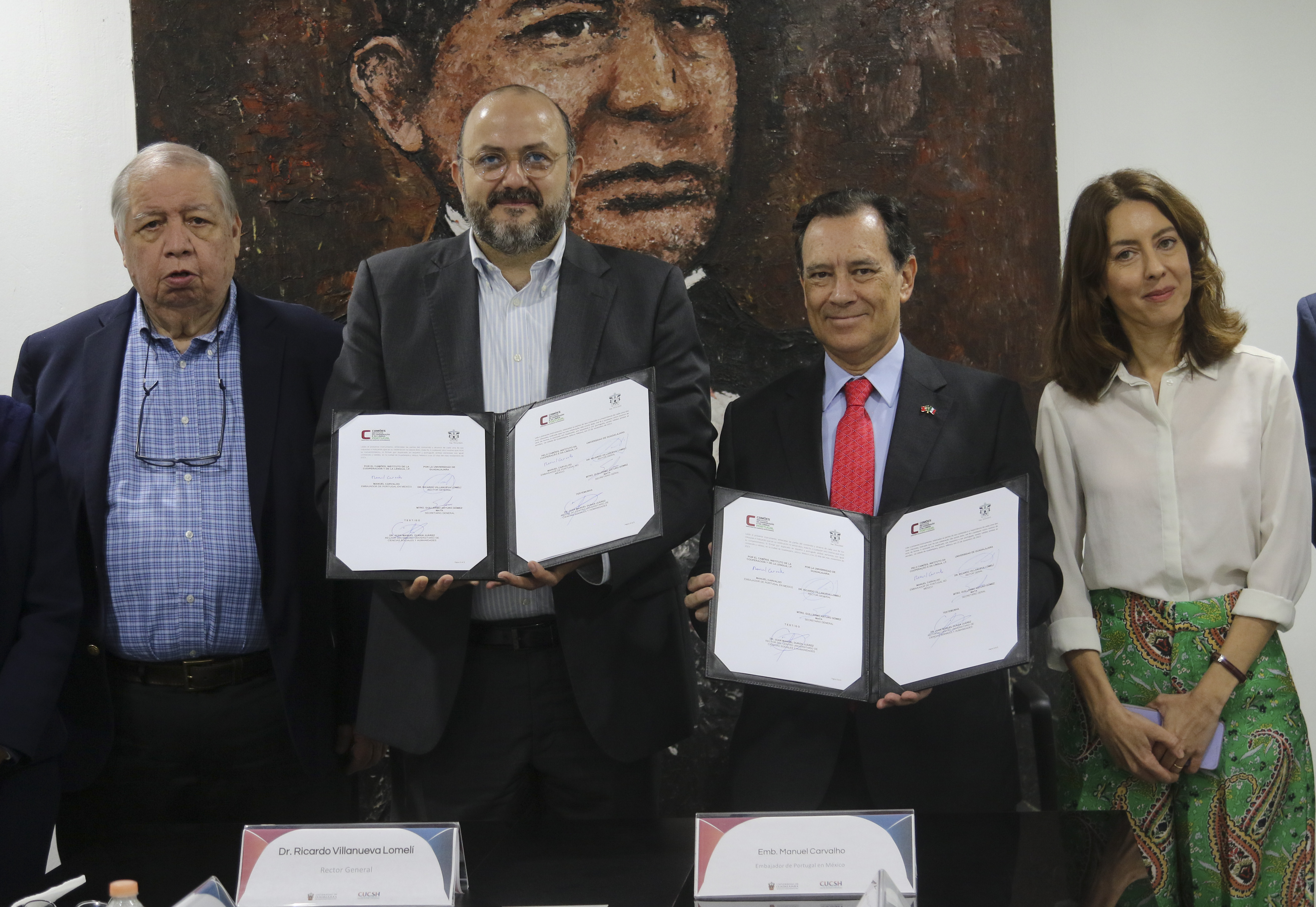 En la firma de convenio de colaboración estuvieron el Secretario General, maestro Guillermo Gómez Mata; la Secretaria Académica del CUCSH, doctora Katia Lozano Uvario; la Jefa del Departamento de Lenguas Modernas, doctora Olivia Díaz Pérez, y la Directora del Instituto Camões, Cláudia Gavinho Burrows.
