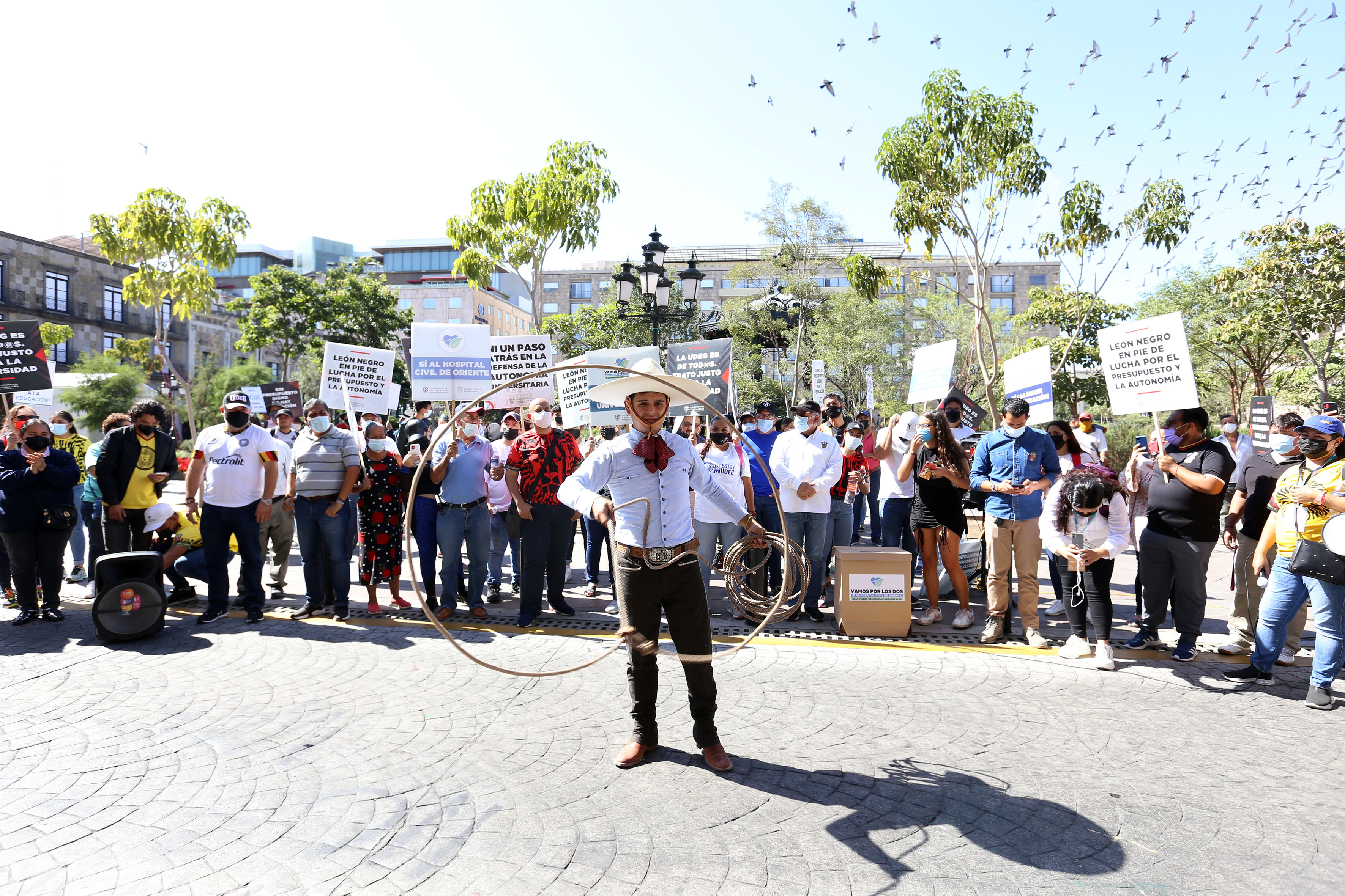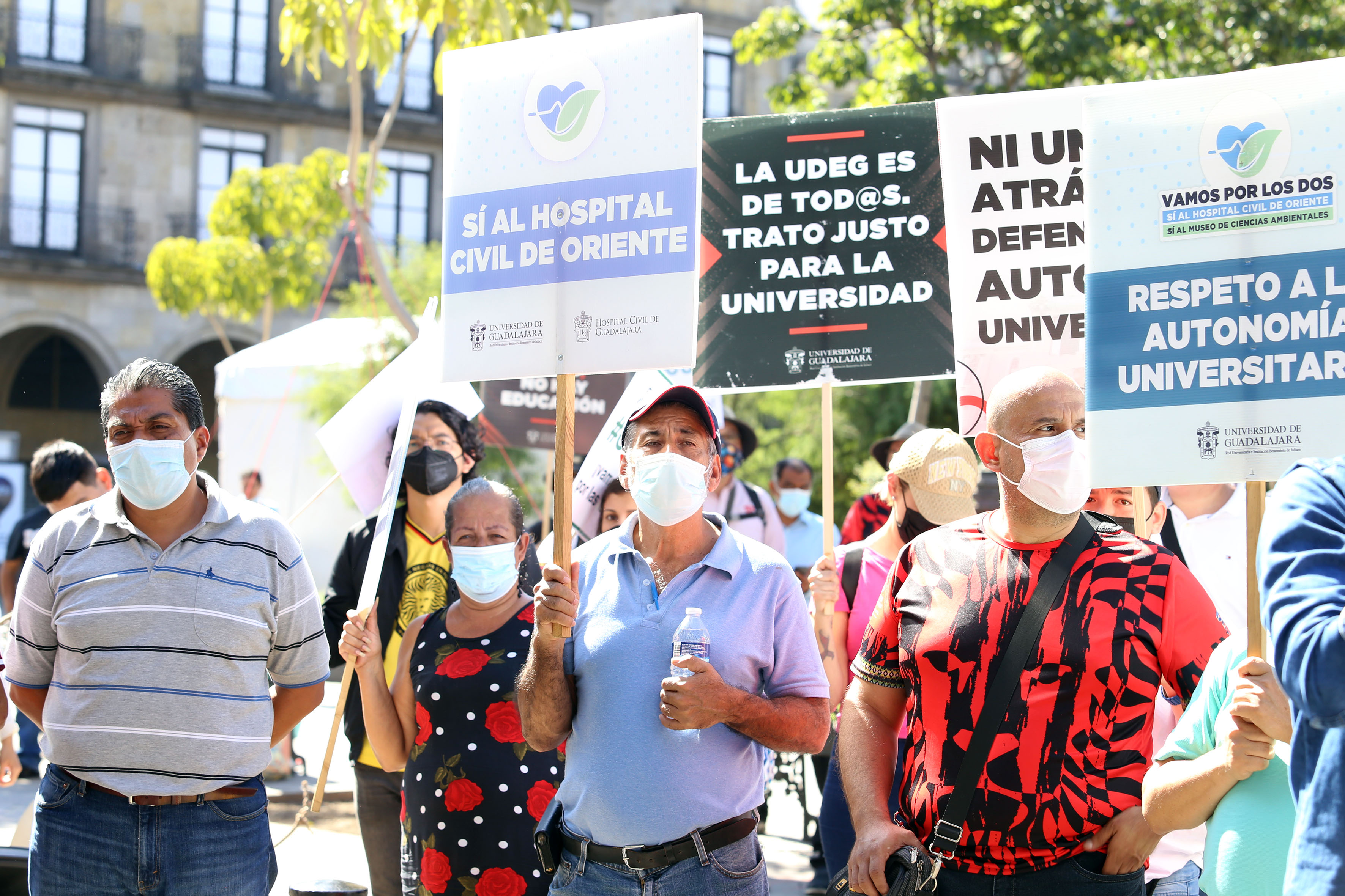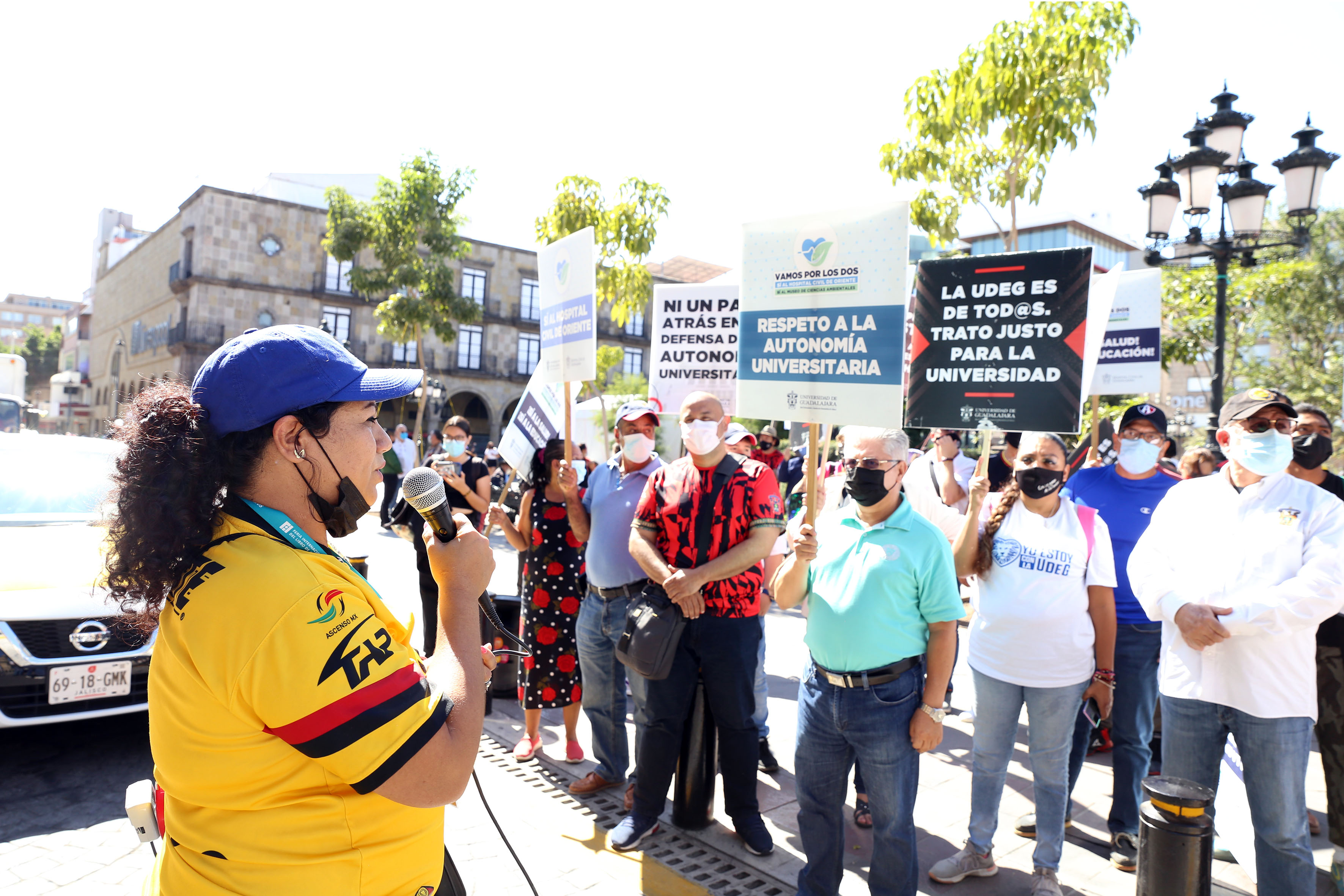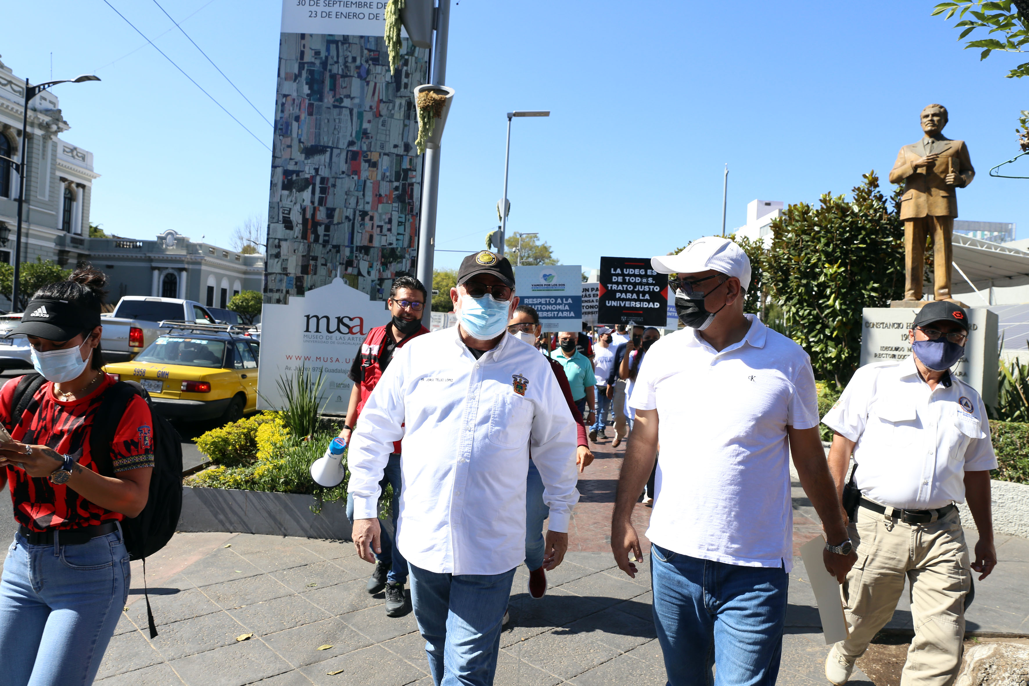 Fueron 63 personas las que salieron de la explanada del edificio de Rectoría General de la UdeG a las 12:30 horas, y llegaron a Palacio de Gobierno media hora después. Los manifestantes caminaron portando cubrebocas, respetaron en todo momento los semáforos, marcharon por las banquetas y sin invadir las calles.