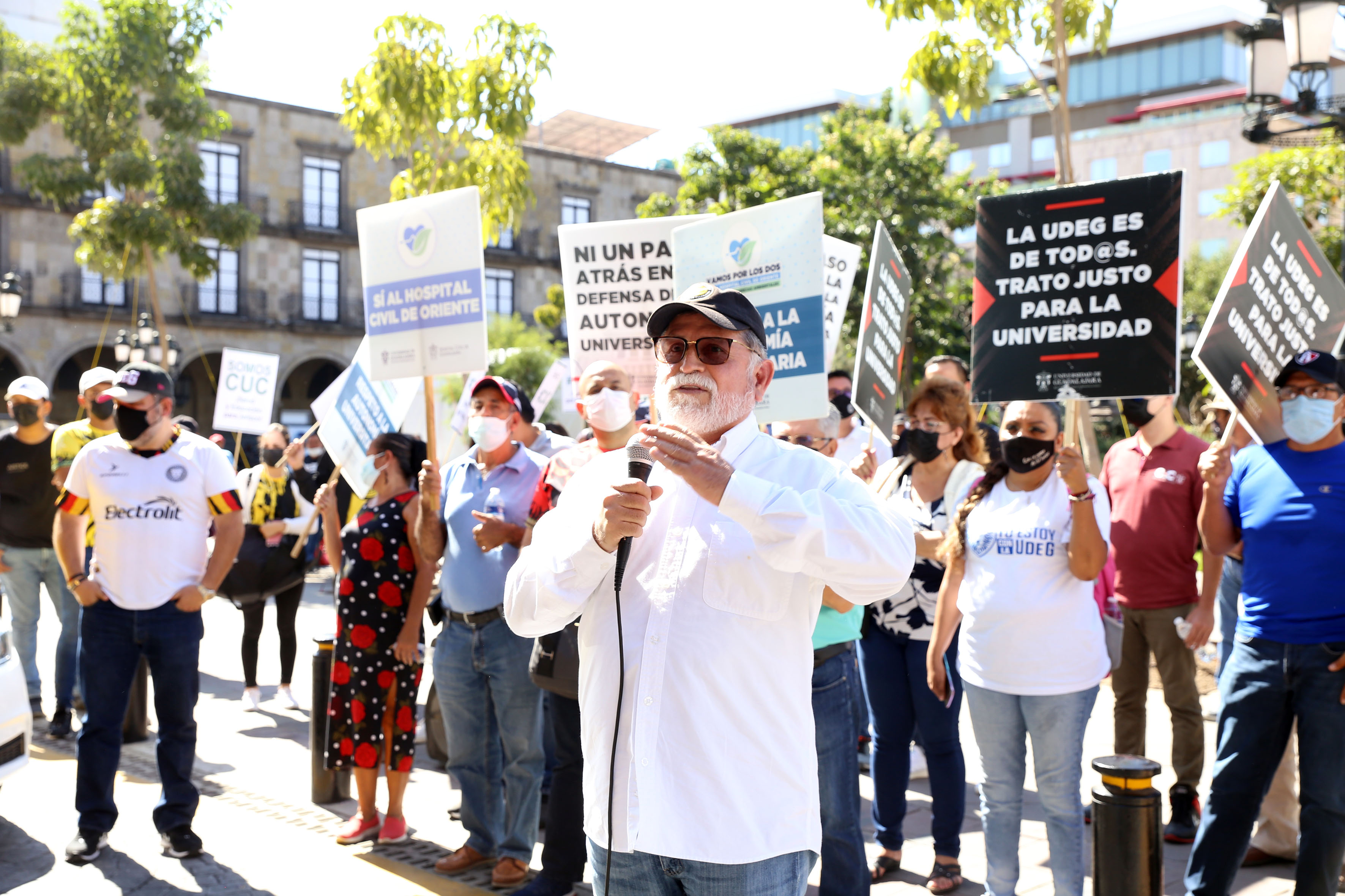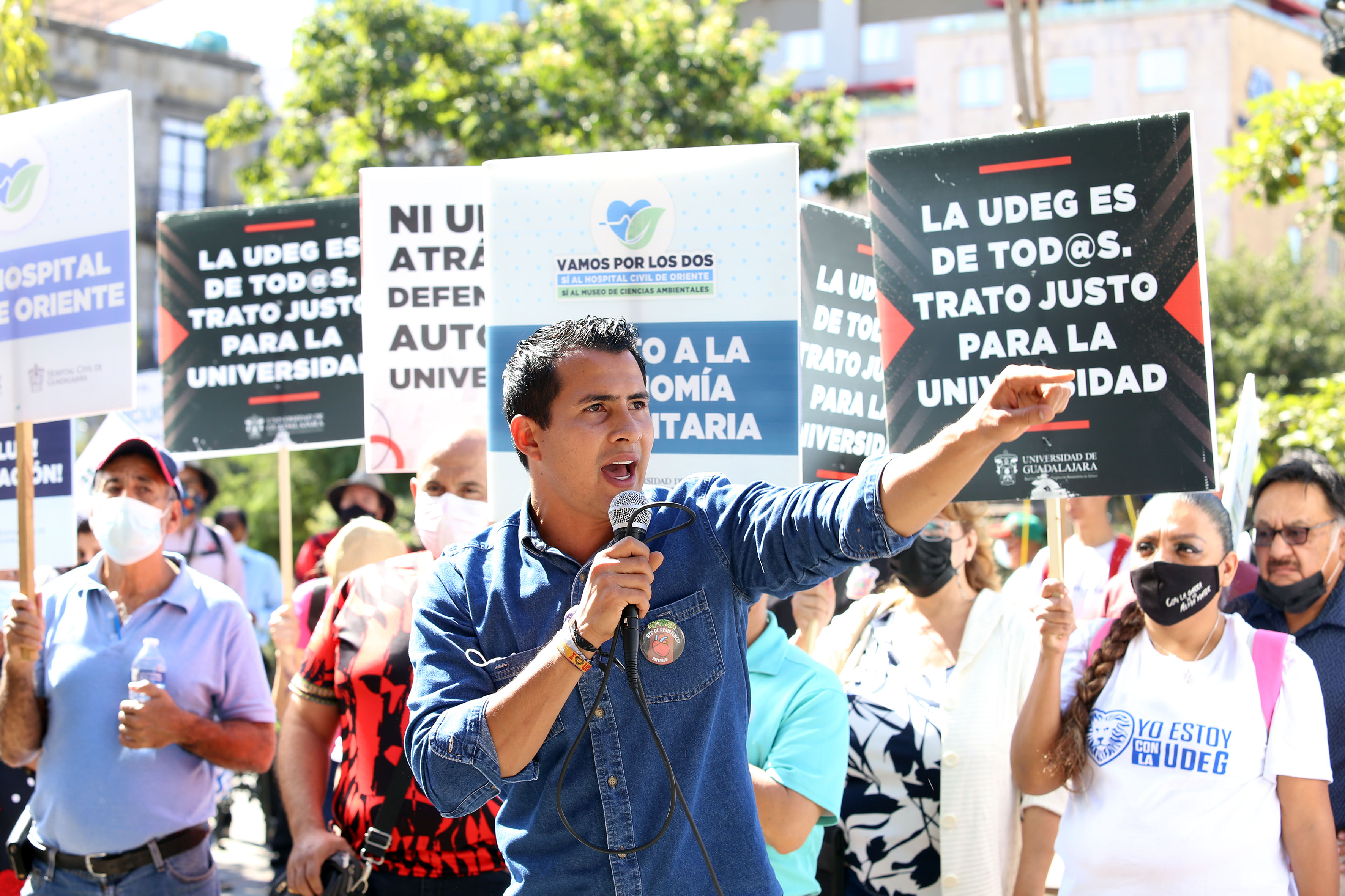 El presidente de la Federación de Estudiantes Universitarios (FEU), Francisco Javier Armenta Araiza; la estudiante del CUCosta, Daiana González Chanes y Ramón Martínez, delegado del Sindicato Único de Trabajadores de la UdeG (SUTUdeG) en Puerto Vallarta, pronunciaron discursos en favor del MCA, la educación y la autonomía universitaria.