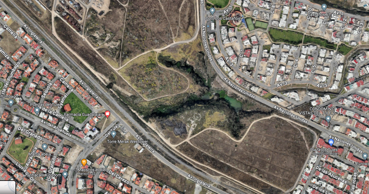 Prácticamente ya toda la cuenca del Río Atemajac en Zapopan está urbanizada, pero justo a la altura de avenida Inglaterra y la calle El Tule, a un costado de las vías del tren, hay una cañada con mucha vegetación por donde corre el agua e incluso hay un gran manantial que se puede ver en el mapa de Google.