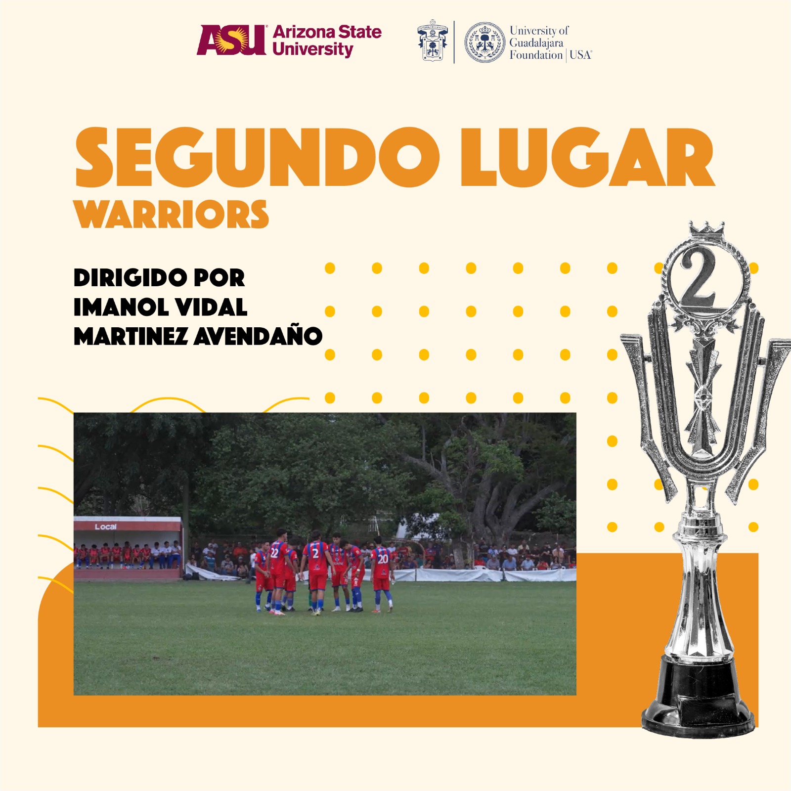 El segundo lugar, que obtuvo un premio de 2 mil 500 dólares, fue para el cortometraje Warriors, de Imanol Martínez Avendaño, egresado de la licenciatura en Artes Visuales del Departamento de Imagen y Sonido (DIS) del Centro Universitario de Arte, Arquitectura y Diseño (CUAAD). En 2021 fue beneficiario de la beca de Producción Artística de Proyectos de Titulación del Legado Grodman, con el documental Ferruco, filme que narra la historia de un guardabosque de la Reserva de la Biosfera Sierra de Manantlán en Jalisco.