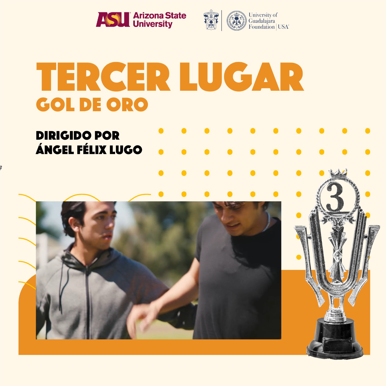 Por su parte, la producción Gol de oro, dirigida por Ángel Félix Lugo, obtuvo el tercer lugar y un premio de mil dólares. Estos incentivos están diseñados para impulsar el desarrollo profesional de realizadores emergentes y fortalecer sus trayectorias dentro de la industria audiovisual.