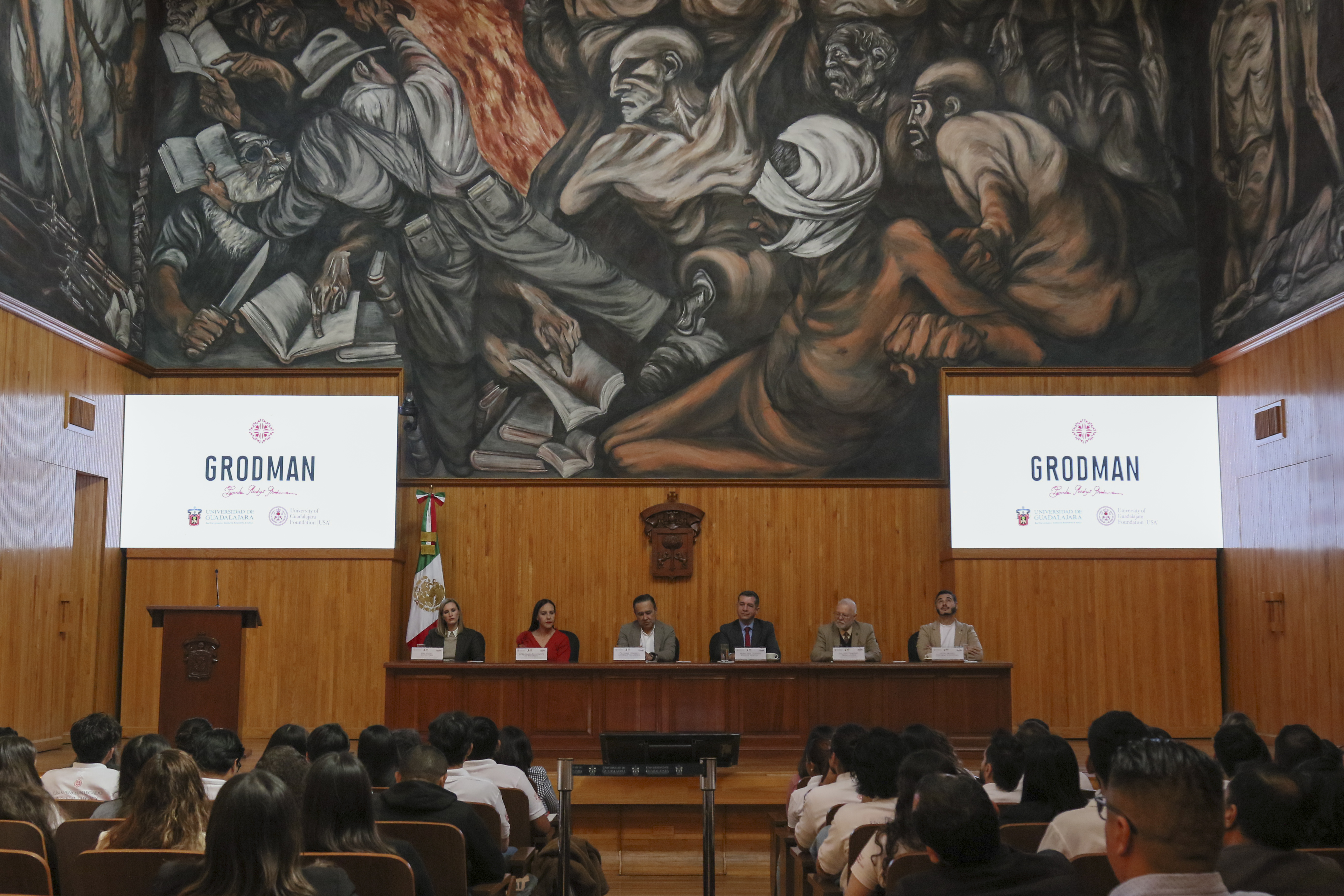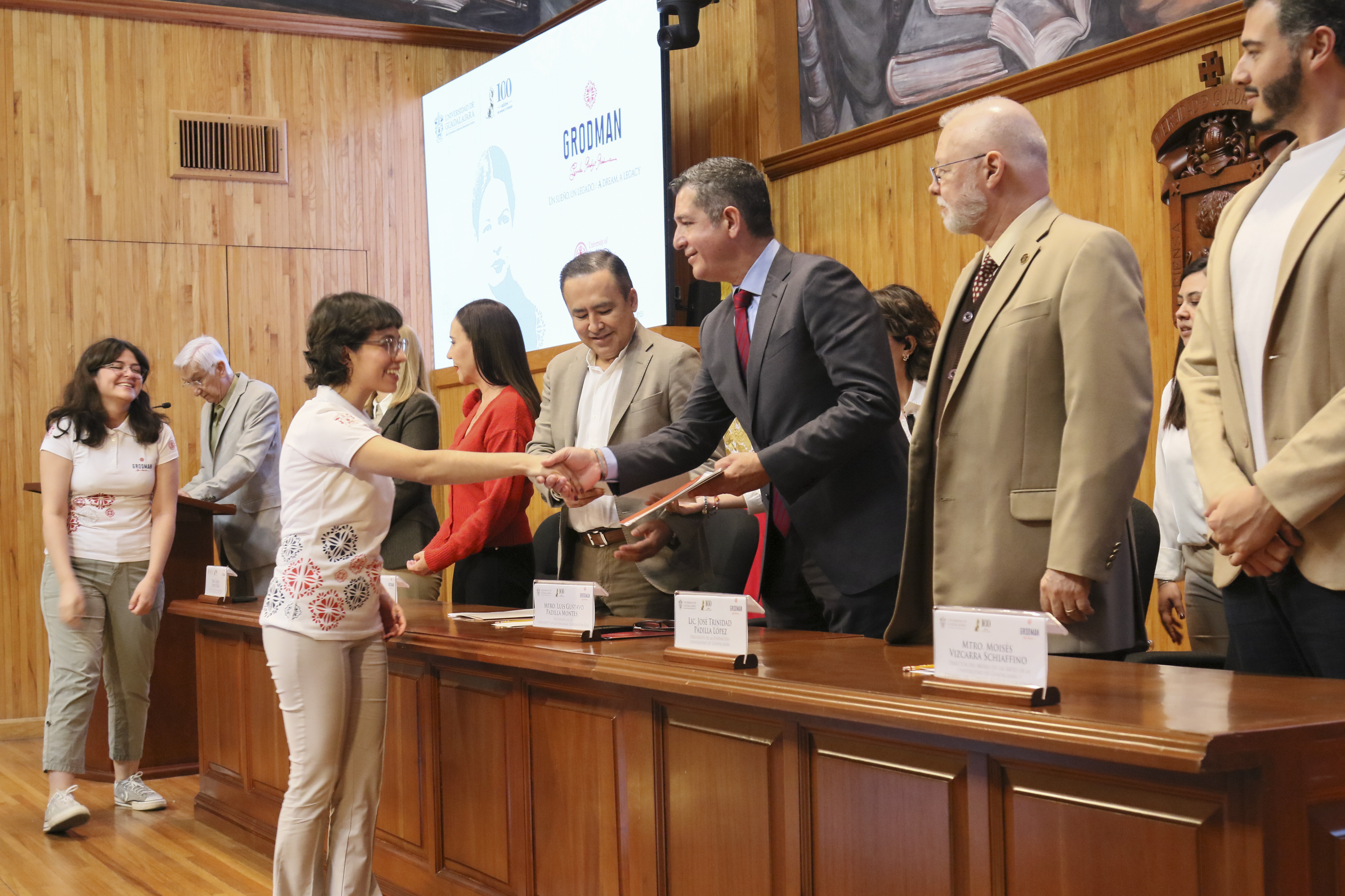 Con el fin de honrar y homenajear el legado de la filántropa y doctora Pyrrha Gladys Grodman, quien mediante un fideicomiso alcanzado en 2017 ha apoyado a más de 500 jóvenes para que continúen con sus estudios universitarios, cursando una especialidad o posgrado en alguna institución de educación superior de México o del extranjero, y para apoyar diversos proyectos artísticos y de titulación, tuvo lugar esta ceremonia en el Paraninfo Enrique Díaz de León de la Universidad de Guadalajara, a donde dieron cita diversas autoridades universitarias, así como los estudiantes beneficiados con dicho apoyo.