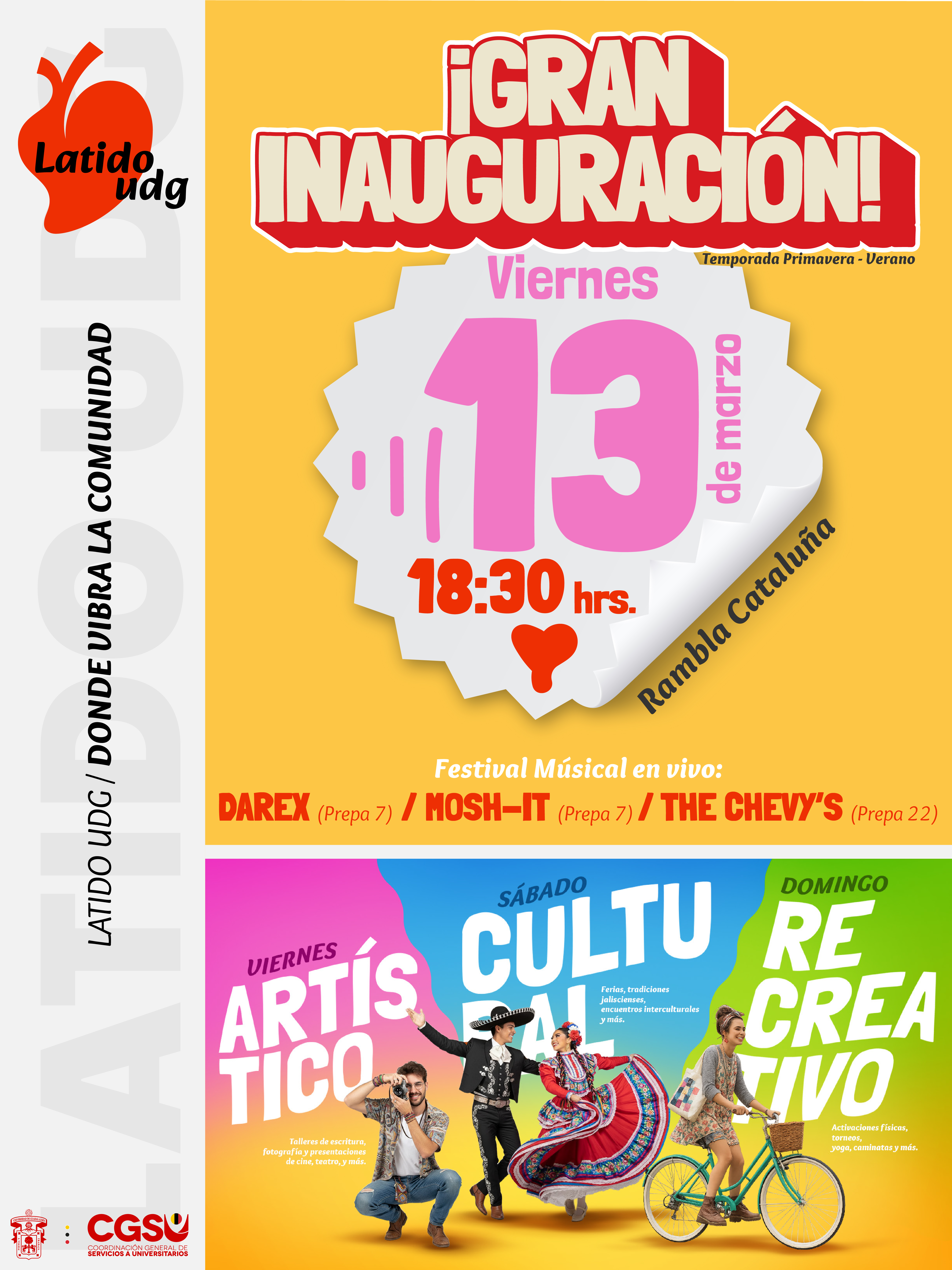 La Universidad de Guadalajara (UdeG), por medio de la Coordinación General de Servicios a Universitarios (CGSU), invita a la comunidad universitaria, a la sociedad en general y a los medios de comunicación a la inauguración de la segunda temporada de Latido UDG, Primavera-Verano 2026, el próximo viernes 13 de marzo, a las 18:30 horas, en la Rambla Cataluña.