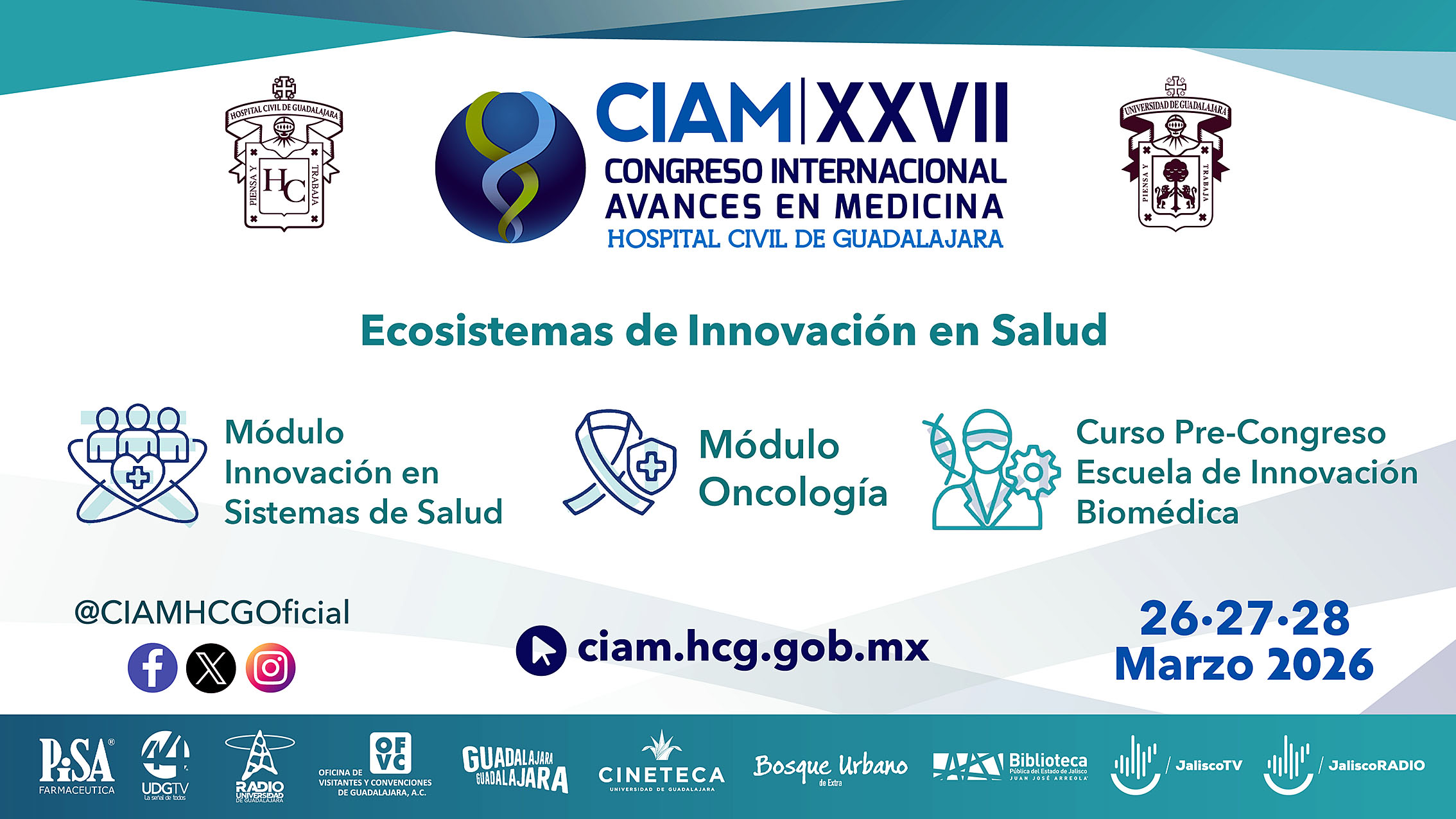 La edición 27 del CIAM y la edición 14 del Congreso Internacional de Enfermería (CIENF), son organizados por el HCG y se llevará a cabo del jueves 26 al sábado 28 de marzo de 2026 en el Conjunto de Artes Escénicas Santander. Las inscripciones están abiertas para profesionales de todas las áreas de la salud. El programa general y los específicos de cada módulo pueden ser consultados en la página del congreso, https://ciam.hcg.gob.mx/