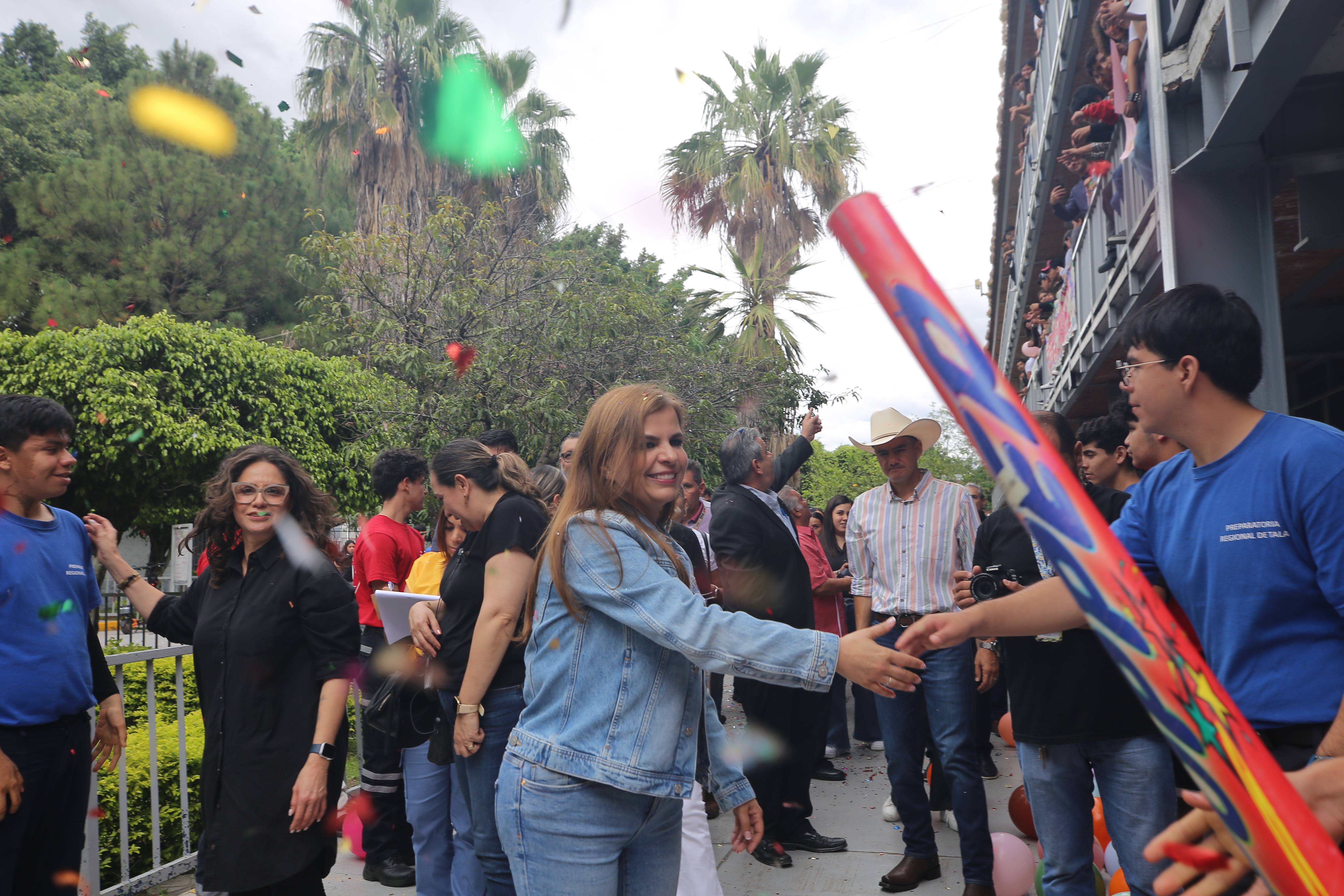 Con flores, banda de guerra y un colorido confeti fue recibida la Rectora General por alumnos de la Preparatoria Regional de Tala y autoridades municipales en el recorrido que realizó este jueves por este plantel de la Región Valles.