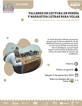 A través de estos talleres, se propicia el gusto por la lectura desde la voz de diferentes historias y poemas, así como la motivación de leer a través de la lectura dialógica, cuyo principal objetivo es fomentar el pensamiento crítico, la creatividad, la solución de problemas.