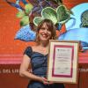 Fue el Rector General de la Universidad de Guadalajara, doctor Ricardo Villanueva Lomelí, quien le entregó el reconocimiento a la autora, en compañía del Presidente de la FIL, licenciado Raúl Padilla López.